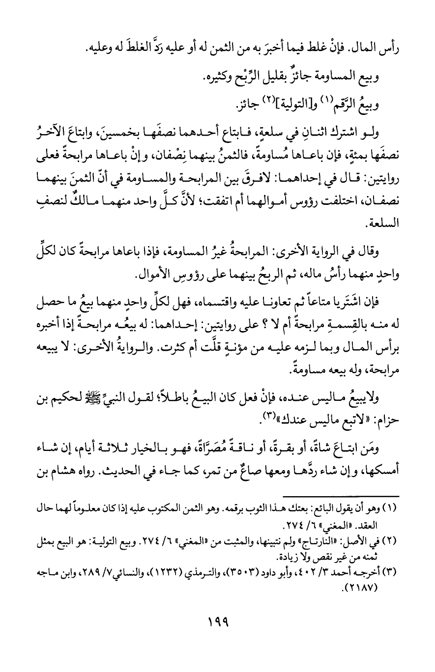 وقال في الرواية الأخرى: المرابحة غير المساومة فإذا باعها مرابحة كل لكل واحد منهما رأس ماله ثم الربع بينهما على رؤوس الأموال.
