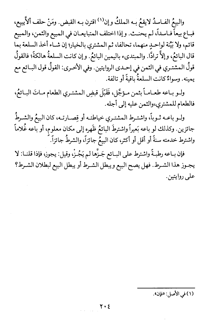 ولو باعه ثوبًا, واشترط المشتري خياطته أو قصارته, كان البيع والشرط جائزين. وكذلك لو باعه بعيرا واشترط البائع ظهره إلى مكان معلوم, أو باعه غلامًا واشترط خدمته سنةً أو أقل أو أكثر, كان البيع جائزًا, والشرطُ جائزًا.