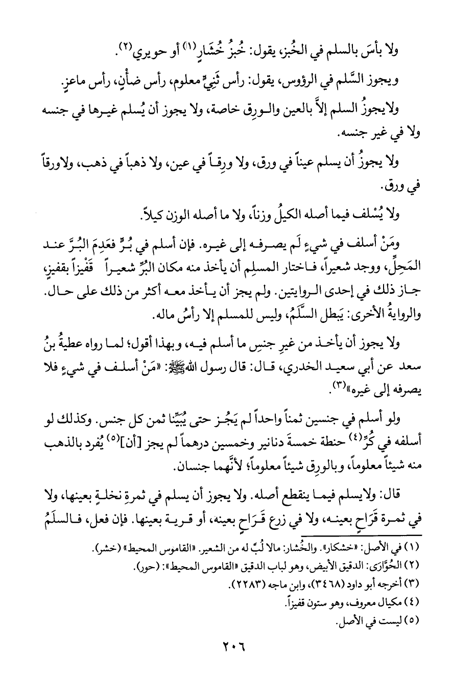 ومَن أسلف في شيء لم يصرفه إلى غيره. فإن أسلم في بُر فعدِم البرَّ عند المحِل ووجد شعيرا, فاختار المُسلم أن يأخذ منه مكان البر شعيرا قفيزًا بقفيز, جاز ذلك في إحدى الروايتين. ولم يجز أن يأخذ معه أكثر من ذلك على حال. والرواية الأخرى: يبطل السلم, وليس للمسلم إلا رأس ماله.