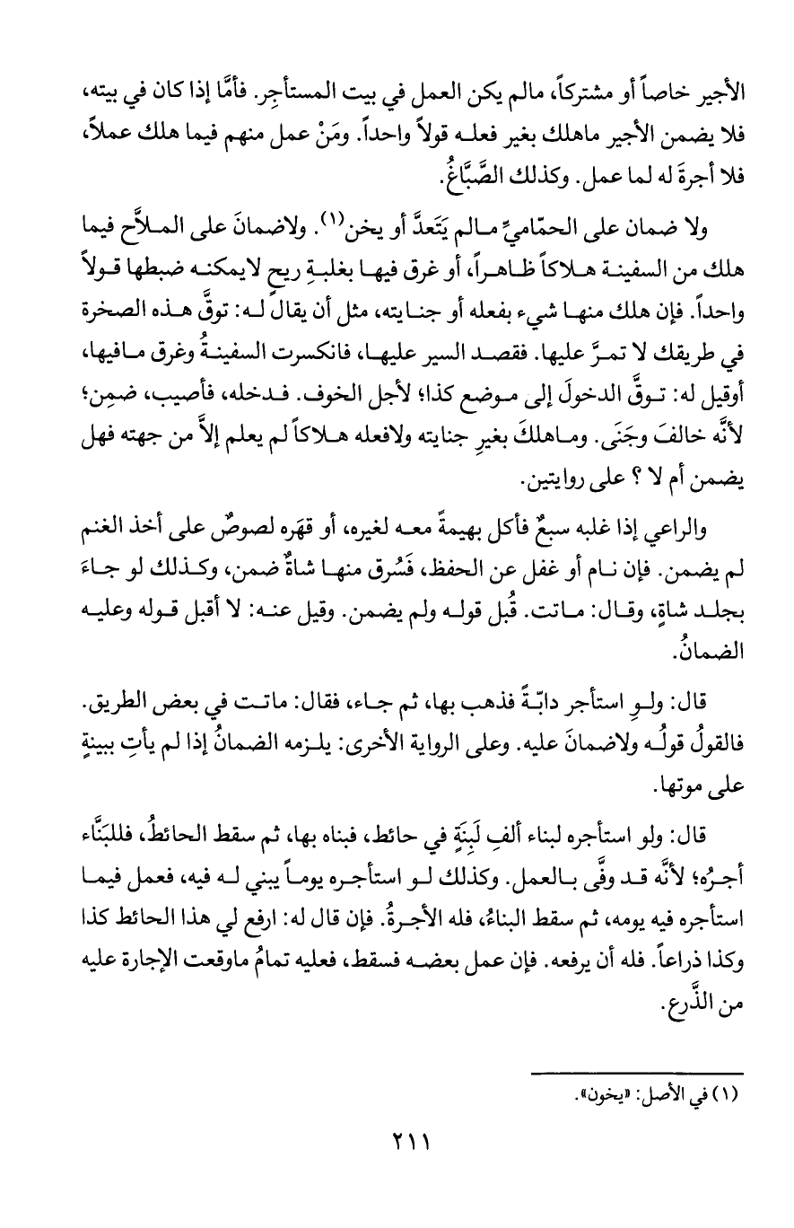 ولا ضمان على الحمَّامي مالم يتعدَّ أو يخن. ولا ضمانَ على الملَاح فيما هلك من السفينة هلاكًا ظاهرًا, أو غرق فيها بغلبة ريح لا يمكنه ضبطها قولا واحدا. فإن هلك منها شيء بفعله أو جنايته, مثل أن يقال له: توقَّ هذه الصخرة في طريقك لا تمرَّ عليها. فقصد السير عليها, فانكسرت السفينة وغرق ما فيها, أو قيل له: توقَّ الدخول إلى موضع كذا؛ لأجل الخوف فدخله, فأصيب, ضمِن؛ لأنه خالف وجَنى. وما هلك بغير جنايته ولا فعله هلاكًا لم يعلم إلا من جهته فهل يضمن أم لا؟ على روايتين.