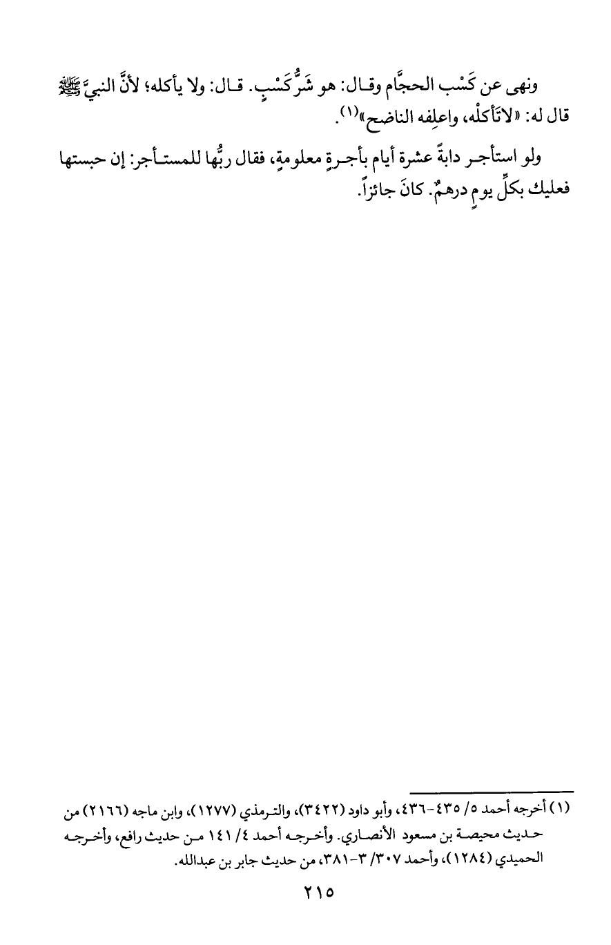 ونهى عن كسب الحجام وقال: هو شر كسب. قال: ولا يأكله؛ لأن النبي صلى الله عليه وسلم قال له: " لا تأكله, واعلفه الناضح ".