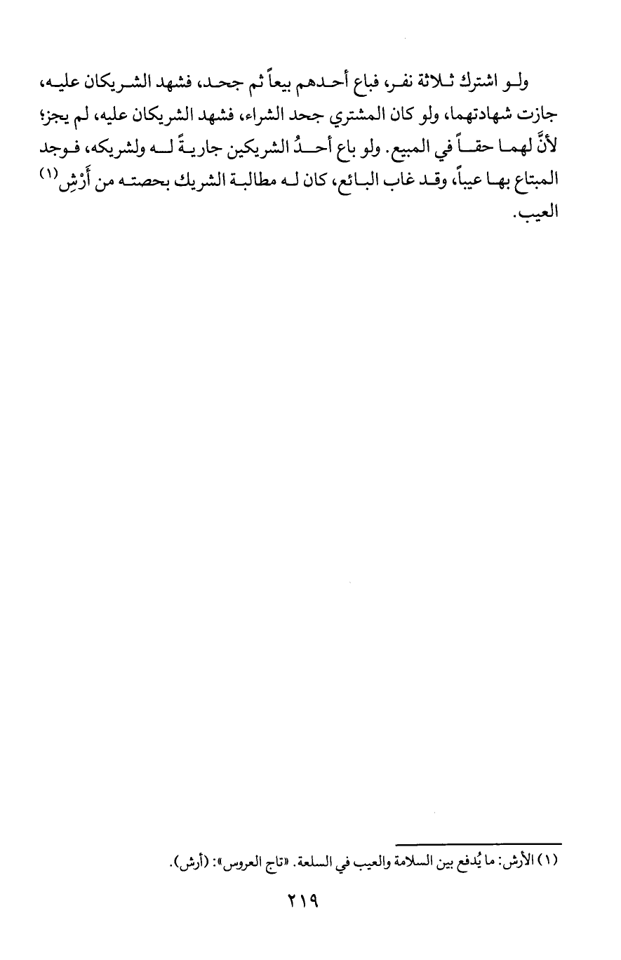 ولو اشترك ثلاثة نفر, فباع أحدهم بيعا ثم جحد, فشهد الشريكان عليه, جازت شهادتهما, ولو كان المشتري جحد الشراء, فشهد الشريكان عليه, لم يجز؛ لأن لهما حقًا في المبيع. ولو باع أحد الشريكين جارية له ولشريكه, فوجد المبتاع بها عيبا, وقد غاب البائع, كان له مطالبة الشريك بحصته من أرش العيب.