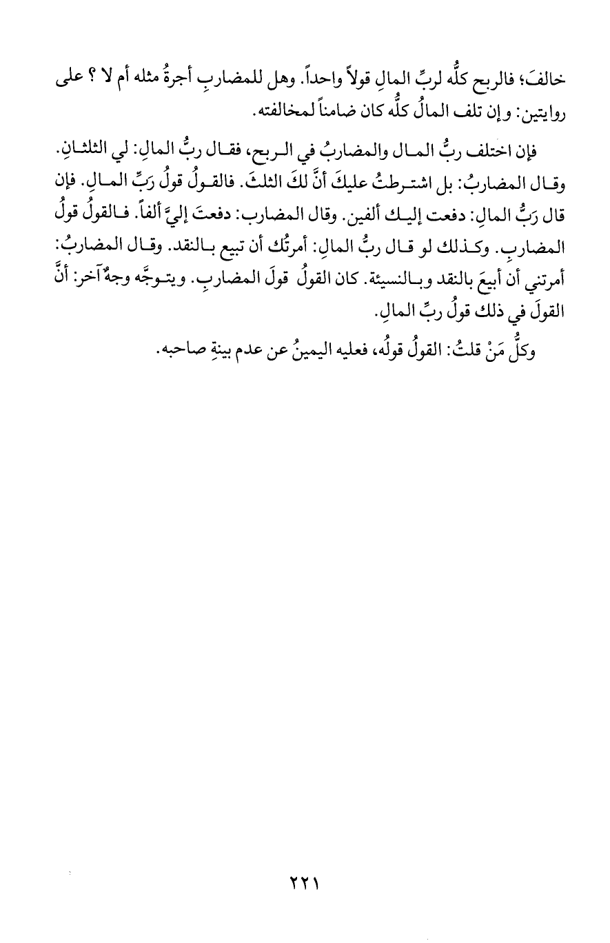 فإن اختلف رب المال والمضارب في الربح, فقال رب المال: لي الثلثان. وقال المضارب: بل اشترطتُ عليك أن لك الثلث. فالقول قول رب المال. فإن قال رب المال: دفعت إليك ألفين. وقال المضارب: دفعت إلي ألفا. فالقول قول المضارب. وكذلك لو قال رب المال: أمرتُك أن تبيع بالنقد. وقال المضارب: أمرتني أن أبيع بالنقد وبالنسيئة. كان القول قول المضارب. ويتوجه وجه آخر: أن القول في ذلك قول رب المال.