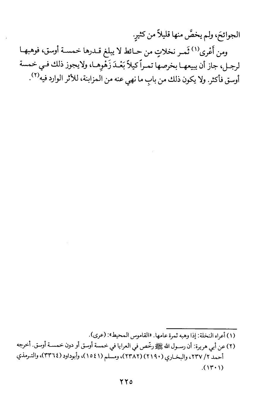 ومن أعرى ثمر نخلات من حائط لا يبلغ قدرها خمسة أوسق, فوهبها لرجل, جاز أن يبيعها بخرصها تمرا كيلا بعد زهوها, ولا يجوز ذلك في خمسة أوسق فأكثر. ولا يكون ذلك من باب ما نهي عنه من المزابنة, لأثر الوارد فيه.