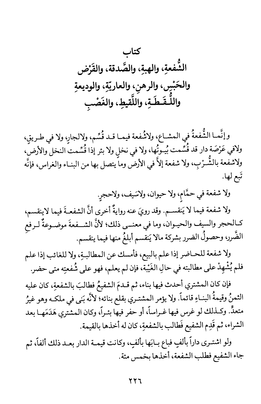 وإنما الشفعة في المشاع, ولا شفعة فيما قد قسم, ولا لجار, ولا في طريق, ولا في عرصة دار قد قسمت بيوتها, ولا في نخل ولا بئر إذا قسمت النخل والأرض, ولا شفعة بالشرب, ولا شفعة إلا في الأرض وما يتصل بها من الباء والغراس, فإنه تبع لها.