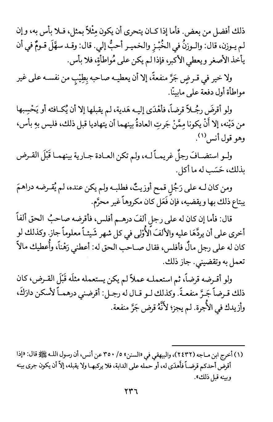 ولا خير في قرضِ جر منفعة, إلا أن يعطيه صاحبه بطيب من نفسه على غير مواطأة أول دفعة على ما بينا.