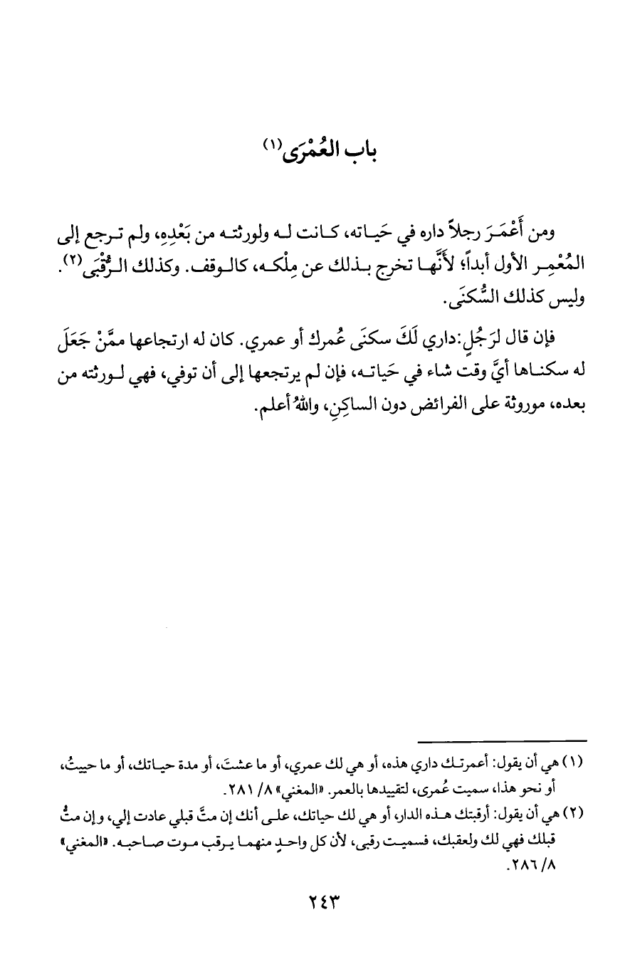 ومن أعمر رجلا داره في حياته, كانت له ولورثته من بعده, ولم ترجع إلى المُعمِر الأول أبدا؛ لأنها تخرج بذلك عن مِلكه, كالوقف. وكذلك الرقبى. وليس كذلك السكنى.