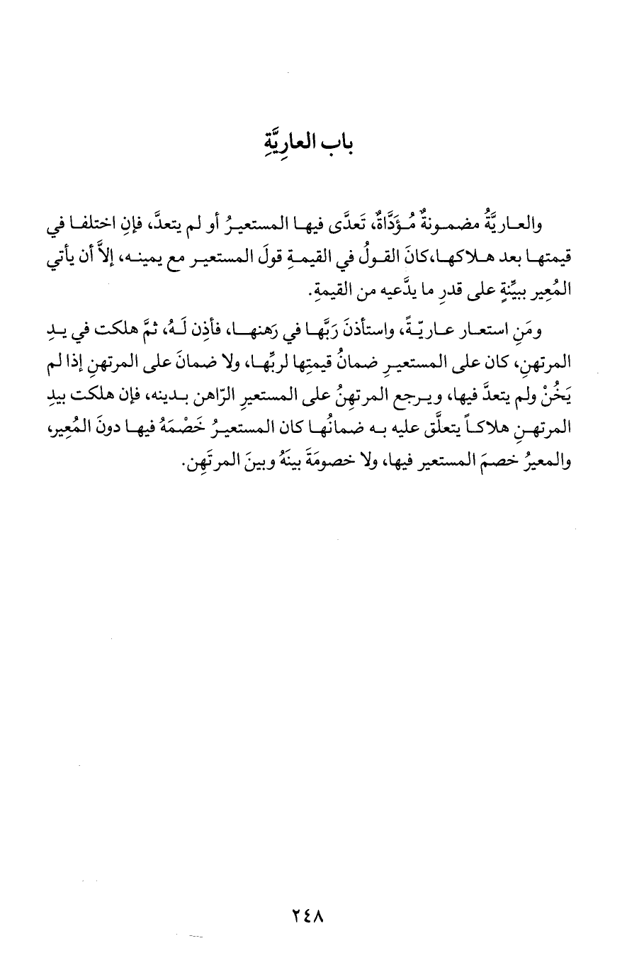 والعارية مضمونة مؤداة, تعدى فيها المستعير أو لم يتعد, فإن اختلفا في قيمتها بعد هلاكها, كان القول في القيمة قول المستعير مع يمينه, إلا أن يأتي المعير ببينة على قدر ما يدعيه من القيمة.