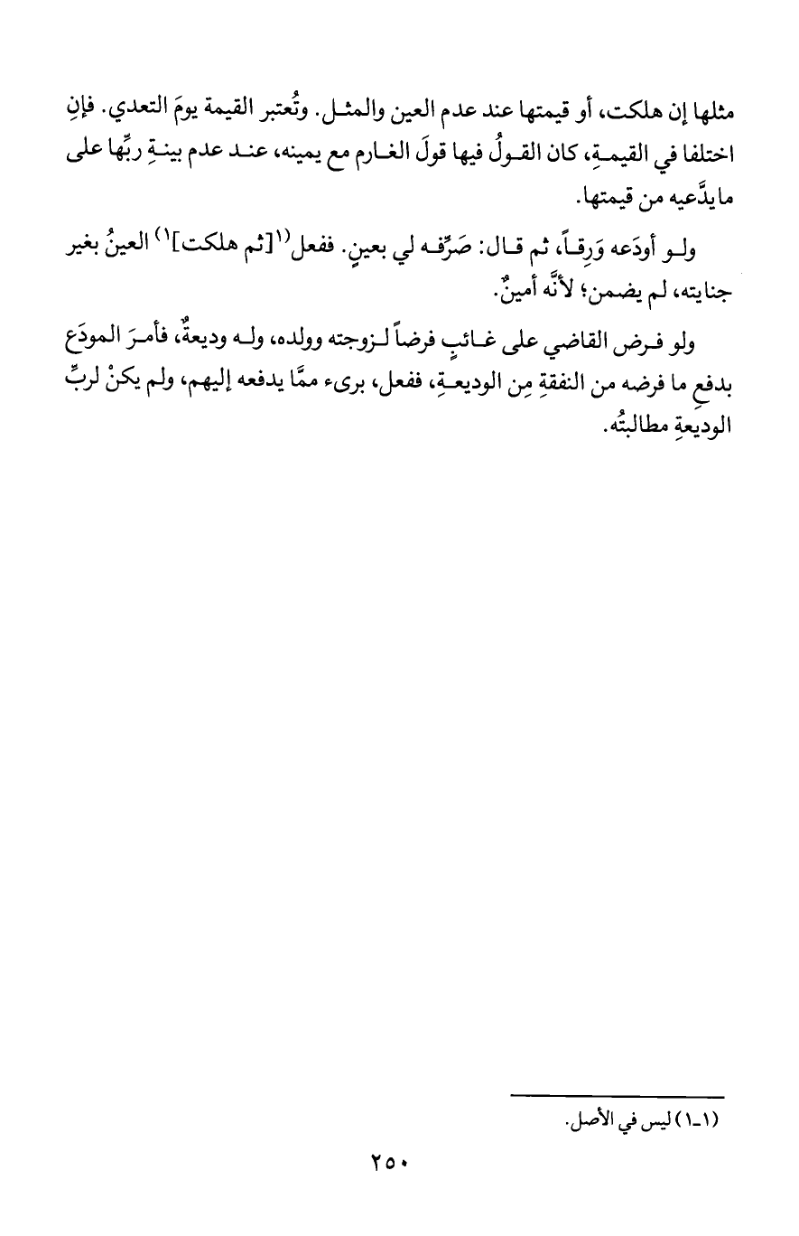 مثلها إن هلكت, أو قيمتها عند عدم العين والمثل. وتُعتبر القيمة يوم التعدي. فإن اختلفا في القيمة, كان القول فيها قول الغارم مع يمينه, عند عدم بينة ربها على ما يدعيه من قيمتها.