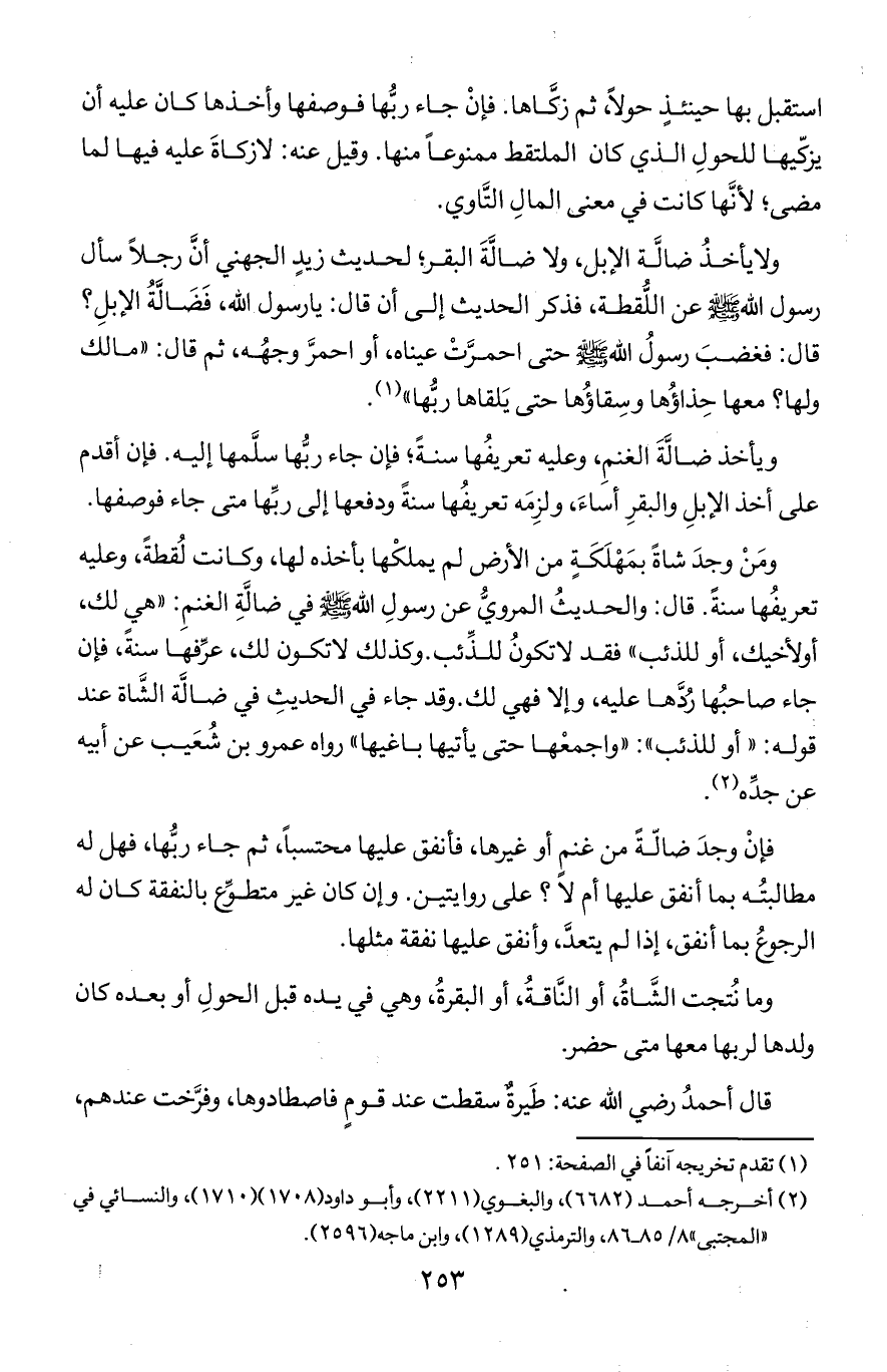 ويأخذ ضالة الغنم, وعليه تعريفها سنة؛ فإن جاء ربها سلمها إليه. فإن أقدم على أخذ الإبل والبقر أساء, ولزمه تعريفها سنة ودفعها إلى ربها من جاء فوصفها.