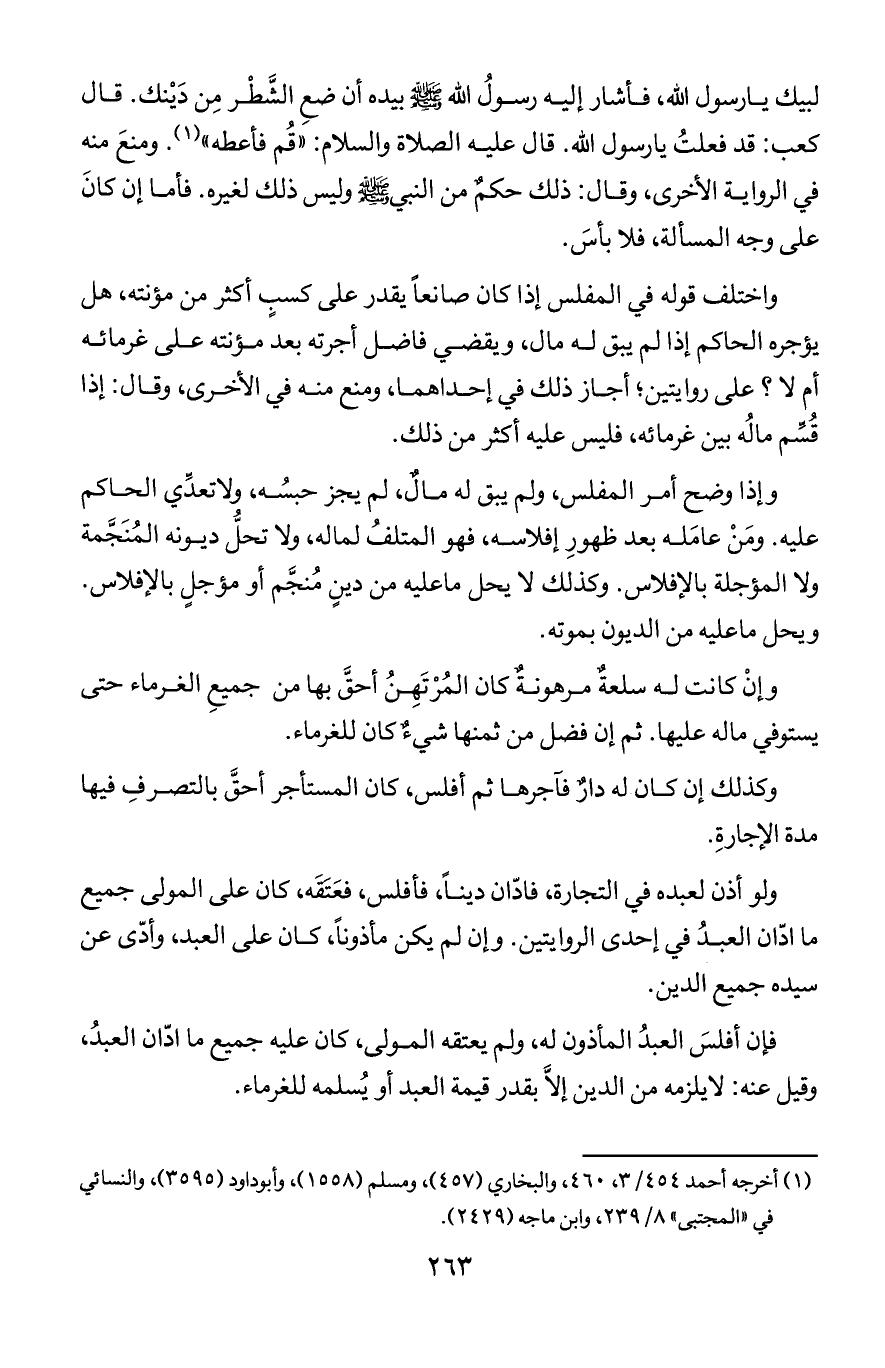 لبيك يا رسول الله, فأشار إليه رسول الله صلى الله عليه وسلم بيده أن ضع الشطر من دينك. قال كعب: قد فعلت يا رسول الله. قال عليه الصلاة والسلام: "قم فأعطه". ومنع منه في الرواية الأخرى, وقال: ذلك حكم من النبي صلى الله عليه وسلم وليس ذلك لغيره. فأما إن كان على وجه المسألة, فلا بأس.
