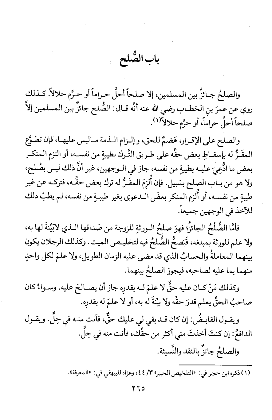 والصلح جائز بين المسلمين, إلا صلحا أحل حراما أو حرم حلال. كذلك روي عن عمر بن الخطاب رضي الله عنه أنه قال: الصلح جائز بين المسلمين إلا صلحا أحل حراما, أو حرم حلالا.