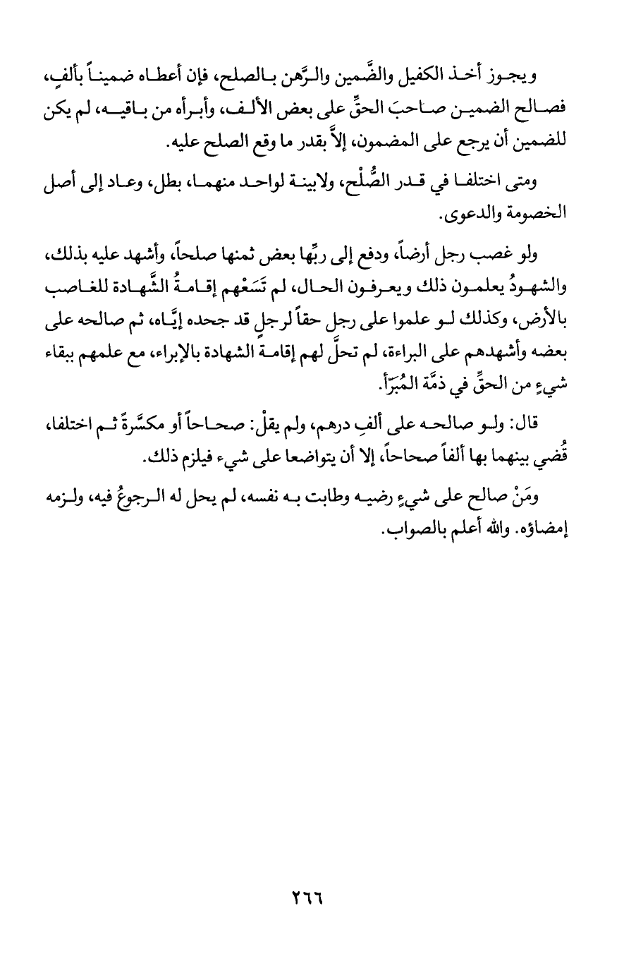 ولو غصب رجل أرضا, وفع إلى ربها بعض ثمنها صلحا, وأشهد عليه بذلك, والشهود يعلمون ذلك ويعرفون الحال, لم تسعهم إقامة الشهادة للغاصب بالأرض, وكذلك لو علموا على رجل حقا لرجل قد جحده إياه, ثم صالحه على بعضه وأشهدهم على البراءة, لم تحل لهم إثامة الشهادة بالإبراء, مع علمهم ببقاء شيء من الحق في ذمة المبرأ.