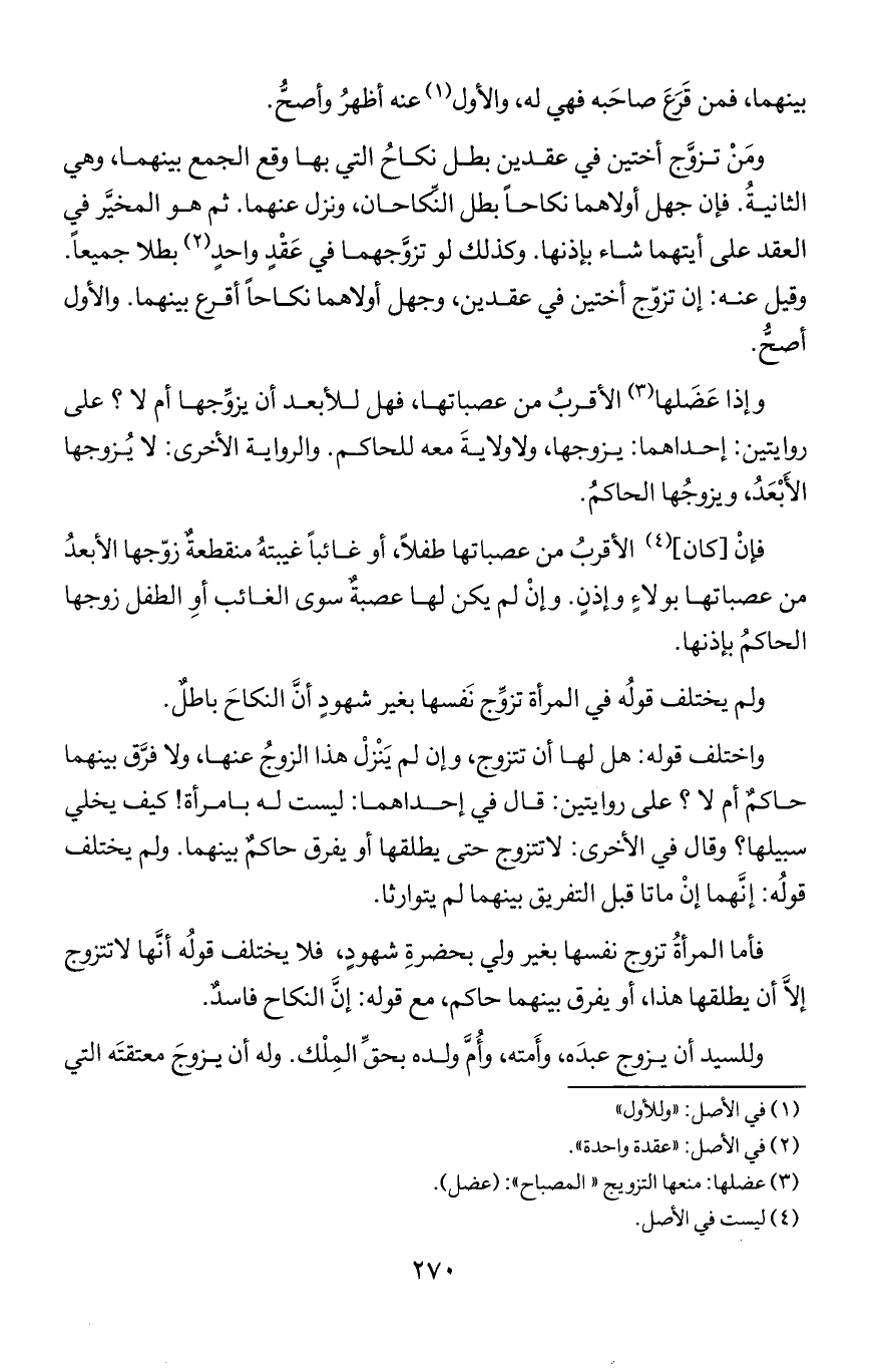 فإن كان الأقرب من عصباتها طفلا, أو غائبا غيبة منقطعة زوجها الأبعد من عصباتها بولاء وإذن. وإن لم يكن لها عصبة سوى الغائب أو الطفل زوجها الحاكم بإذنها.
