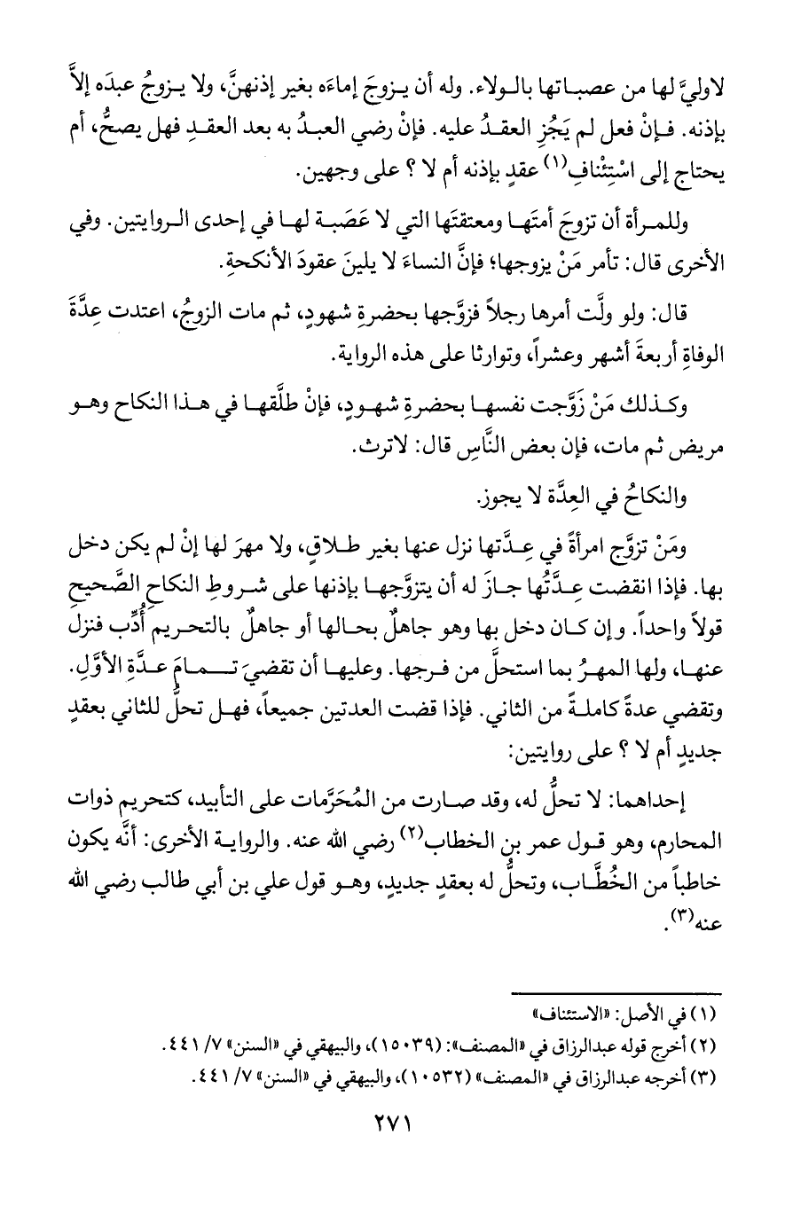 ومن تزوج امرأة في عدتها نزل عنها بغير طلاق, ولا مهر لها إن لم يكن دخل بها. فإذا انقضت عدتها جاز له أن يتزوجها بإذنها على شروط النكاح الصحيح قولا واحدا. وإن كان دخل بها وهو جاهل بحالها أو جاهل بالتحريم أُدب فنزل عنها, ولها المهر بما استحل من فرجها. وعليها أن تقضي تمام عدة الأول. وتقضي عدة كاملة من الثاني. فإذا قضت العدتين جميعا, فهل تحل للثاني بعقد جديد أم لا؟ على روايتين: