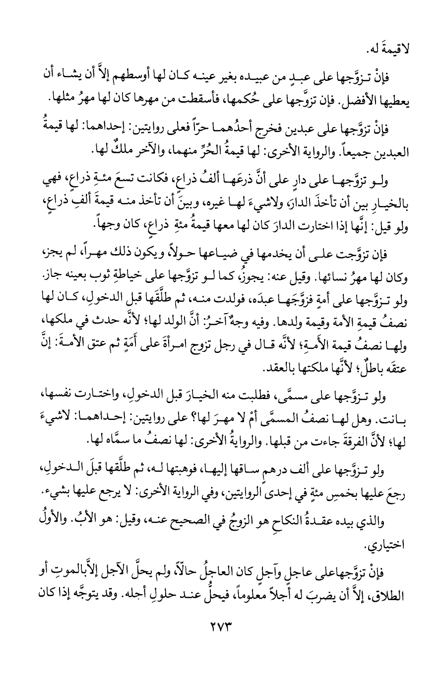 فإن تزوجها على عبدين فخرج أحدهما حرا فعلى روايتين: إحداهما: لها قيمة العبدين جميعا. والرواية الأخرى: لها قيمة الحر منهما, والآخر ملك لها.