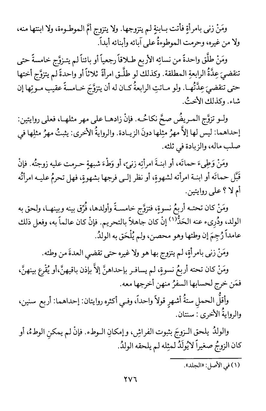 ومن طلق واحدة من نسائه الأربع طلاقا رجعيا أو بائنا لم يتزوج خامسة حتى تنقضي عدة الرابعة المطلقة. وكذلك لو طلق امرأة ثلاثا أو واحدة لم يتزوج أختها حتى تنقضي عدتها. ولو ماتت الرابعة كان له أن يتزوج خامسة عقيب موتها إن شاء. وكذلك الأخت.