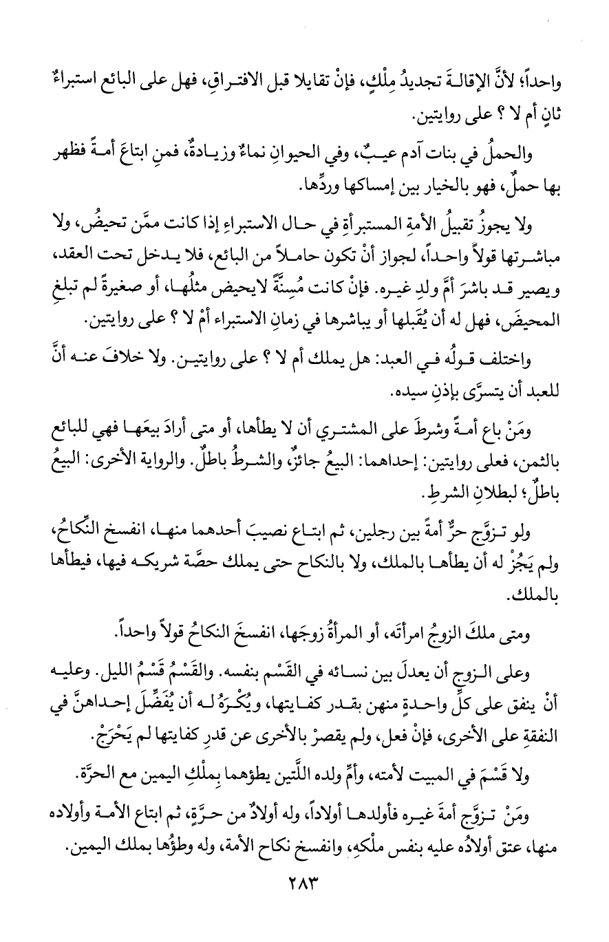 ومن باع أمة وشرط على المشتري ألا يطأها, أو متى أراد بيعها فهي للبائع بالثمن, فعل روايتين: إحداهما: البيع جائز, والشرط باطل. والرواية الأخرى: البيع باطل؛ لبطلان الشرط.
