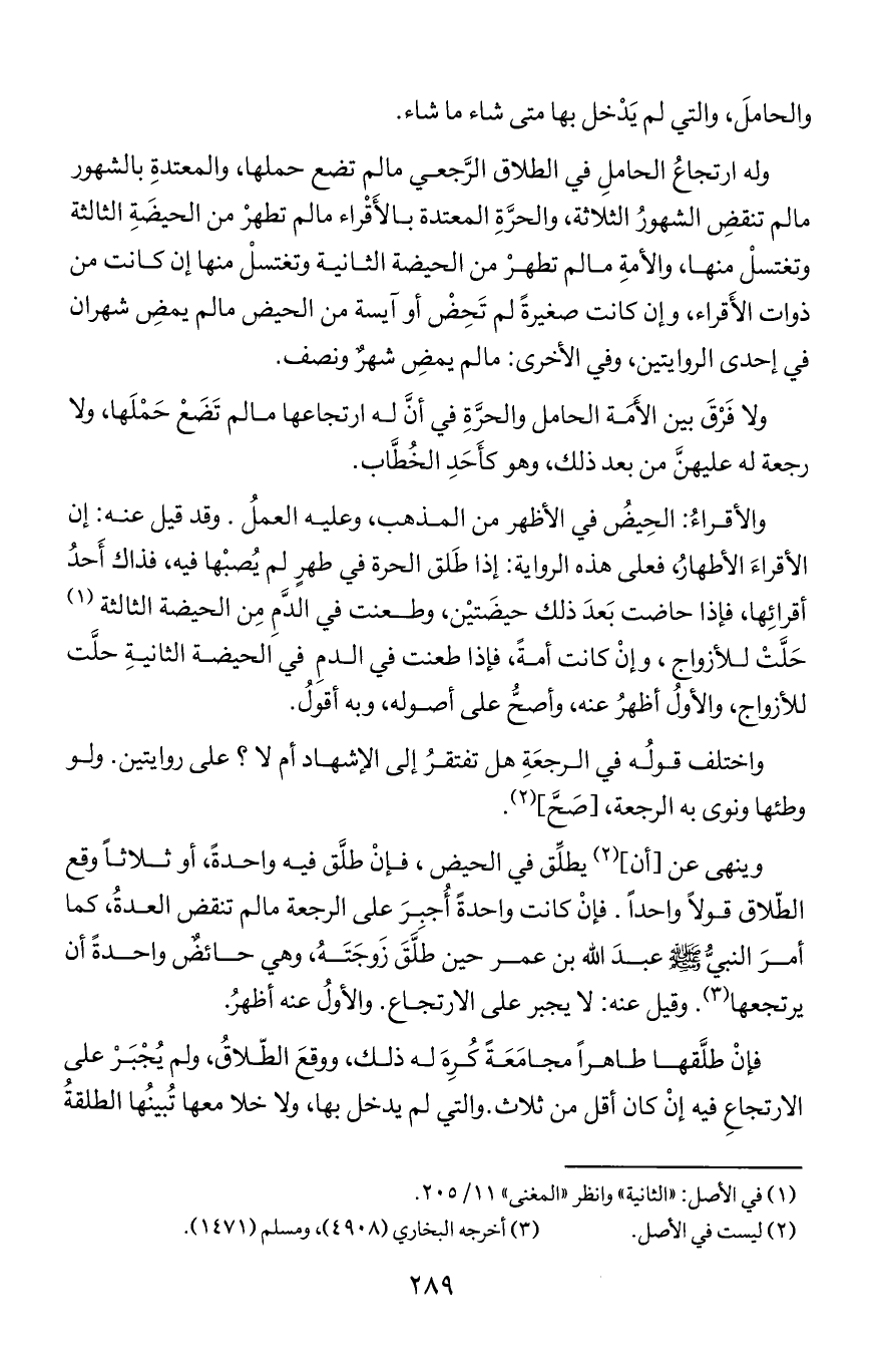 وله ارتجاع الحامل في الطلاق الرجعي ما لم تضع حملها, والمعتدة بالشهور ما لم تنقض الشهور الثلاثة, والحرة المعتدة بالأقراء ما لم تطهر من الحيضة الثالثة وتغتسل منها, والأمة ما لم تطهر من الحيضة الثانية وتغتسل منها إن كانت من ذوات الأقراء, وإن كانت صغيرة لم تحض أو آيسة من الحيض ما لم يمض شهران في إحدى الروايتين, وفي الأخرى: ما لم يمض شهر ونصف.