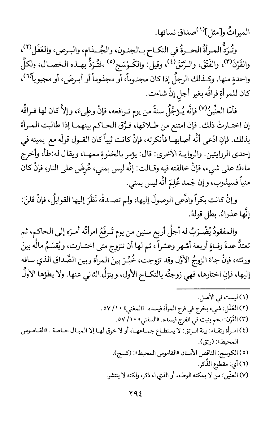 وترد المرأة الحرة في النكاح بالجنون, والجذام, والبرص, والعَفَل, والقرن, والفتق, والرتق, وقيل: والكوسج, فترد بهذه الخصال, ولكل واحدة منها. وكذلك الرجل إذا كان مجنونا, أو مجذوما أو أبرص, أو مجبوبا, كان للمرأة فراقه بغير أجل إن شاءت.