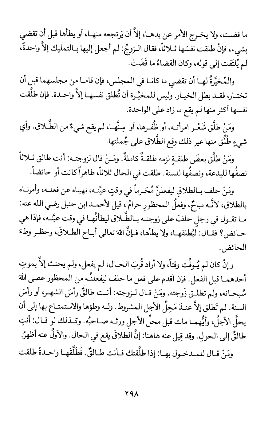 ومن حلف بالطلاق ليفعلن محرما في وقت عينه, نهيناه عن فعله, وأمرناه بالطلاق, لأنه مباح, وفعل المحظور حرام, قيل لأحمد ابن حنبل رضي الله عنه: ما تقول في رجل حلف على زوجته بالطلاق ليطأنها في وقت عينه, فإذا هي حائض؟ فقال: ليُطلقها, ولا يطأها, فإن الله تعالى أباح الطلاق, وحظر وطء الحائض.