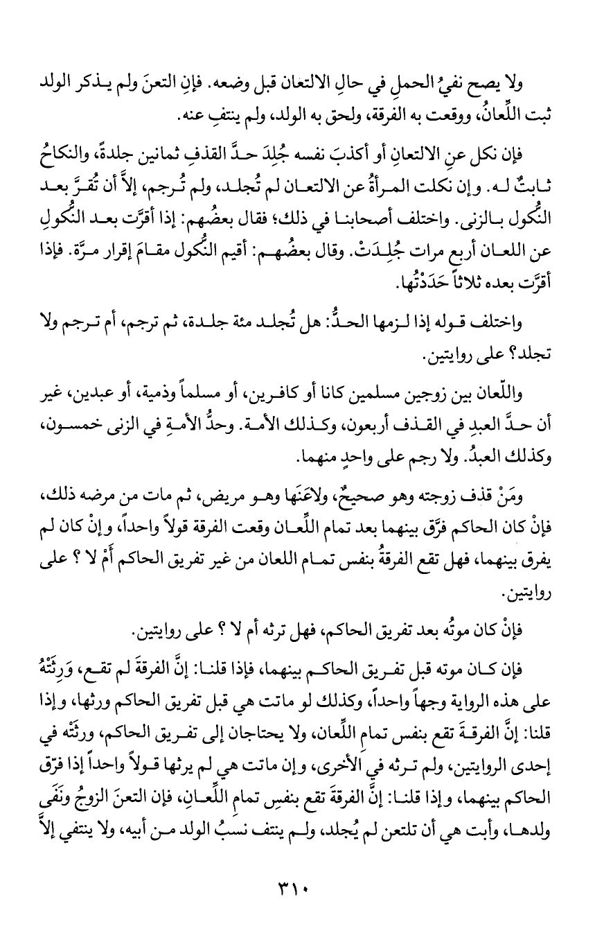 واللعان بين زوجين مسلمين كانا أو كافرين, أو مسلما وذمية, أو عبدين, غير أن حد العبد في القذف أربعون, وكذلك الأمة. وحد الأمة في زنى خمسون, وكذلك العبد. ولا رجم على واحد منهما.