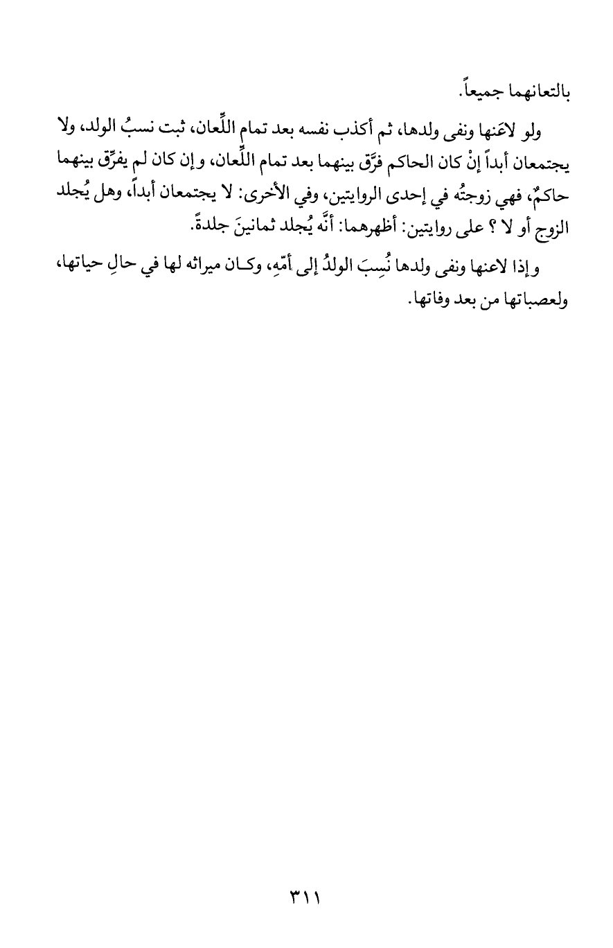 ولو لاعنها ونفى ولدها, ثم أكذب نفسه بعد تمام اللعان, ثبت نسب الولد, ولا يجتمعان أبدا إن كان الحاكم فرق بينهما بعد تمام اللعان, وإن كان لم يفرق بينهما حاكم, فهي زوجته في إحدى الروايتين, وفي الأخرى: لا يجتمعان أبدا, وهل يجلد الزوج أو لا؟ على روايتين: أظهرهما: أنه يجلد ثمانين جلدة.