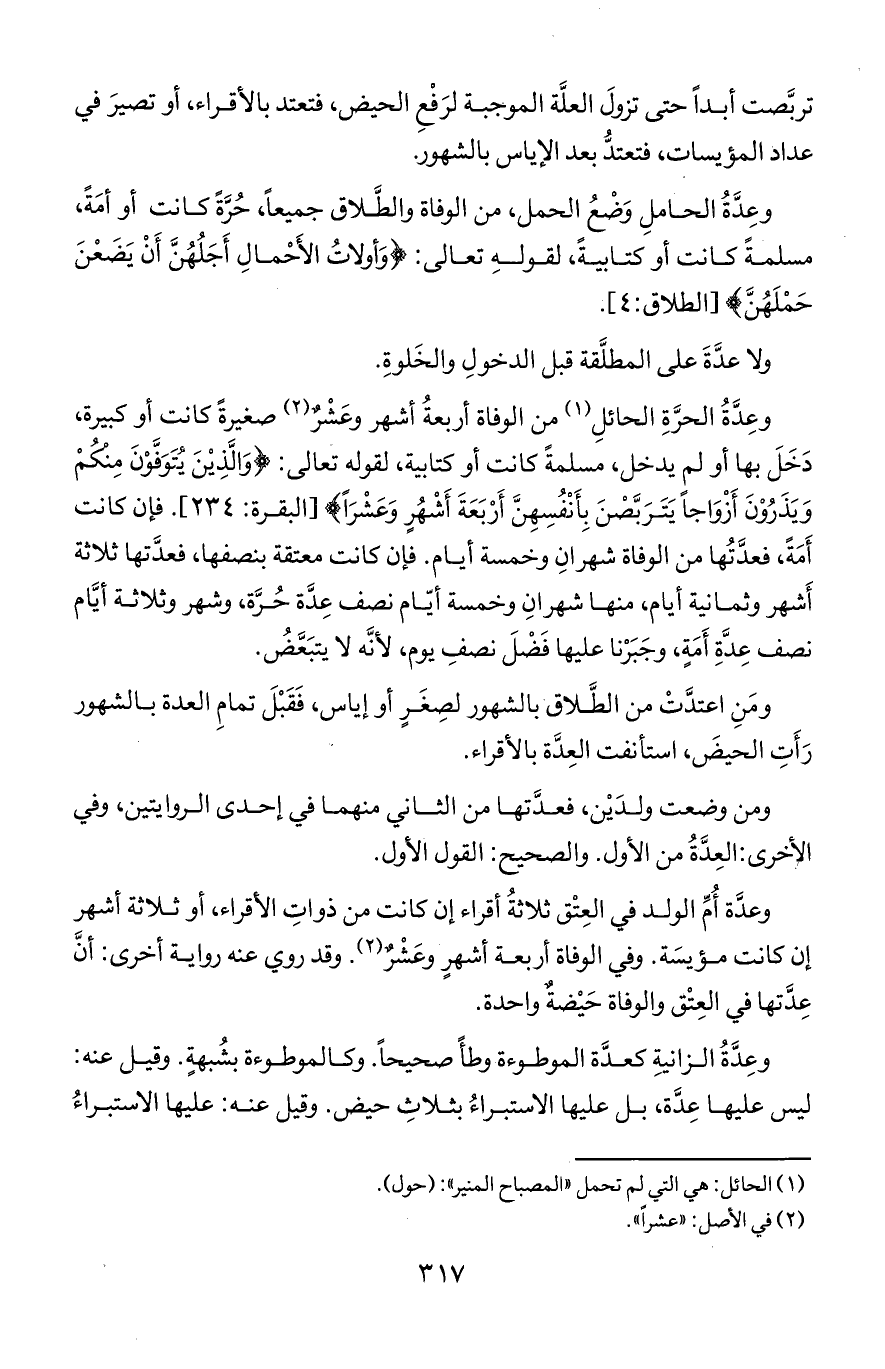 وعدة الحرة الحائل من الوفاة أربعة أشهر وعشر صغيرة كانت أو كبيرة, دخل بها أو لم يدخل, مسلمة كانت أو كتابية, لقوله تعالى: {والذين يتوفون منكم ويذرون أزواجا يتربصن بأنفسهن أربعة أشهر وعشرا} [البقرة:234]. فإن كانت أمة, فعدتها من الوفاة شهران وخمسة أيام. فإن كانت معتقة بنصفها, فعدتها ثلاثة أشهر وثمانية أيام, منها شهران وخمسة أيام نصف عدة حرة, وشهر وثلاثة أيام نصف عدة أمة, وجبرنا عليها فضل نصف يوم, لأنه لا يتبعض.