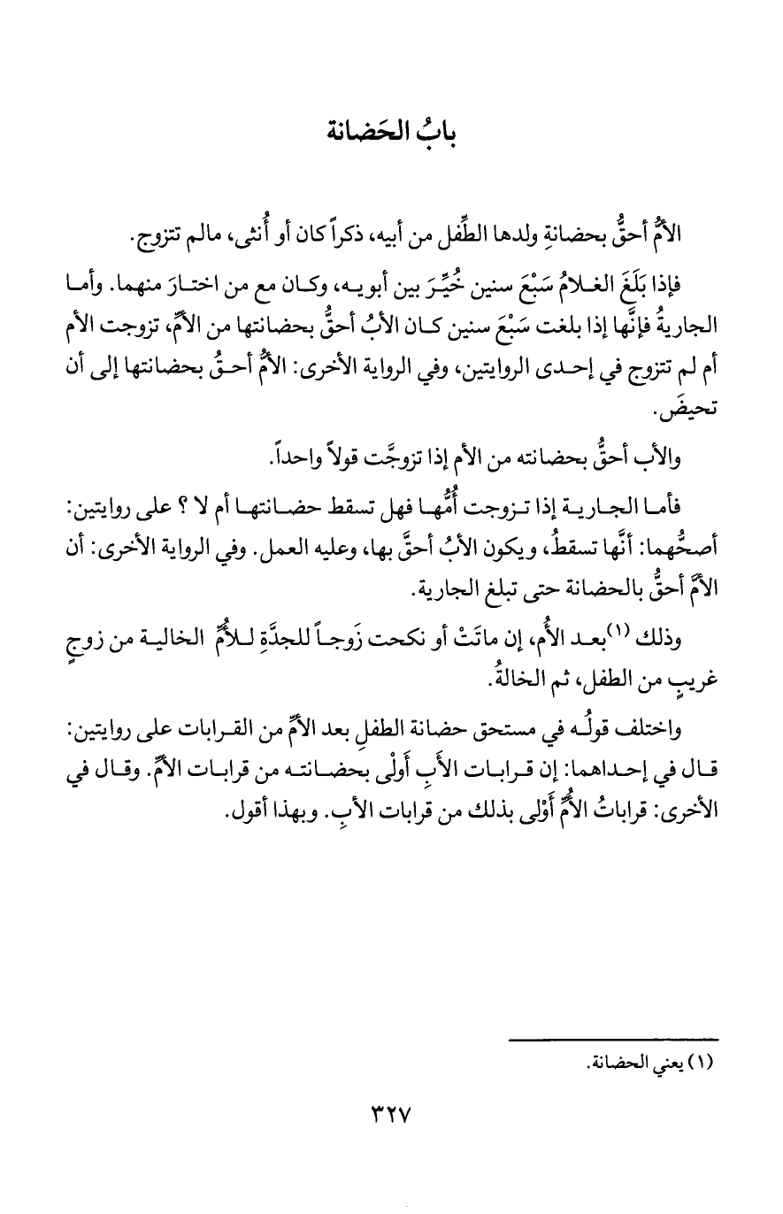 واختلف قوله في مستحق حضانة الطفل بعد الأم من القرابات على روايتين: قال في إحداهما: إن قرابات الأب أولى بحضانته من قرابات الأم. وقال في الأخرى: قرابات الأم أولى بذلك من قرابات الأب. وبهذا أقول.