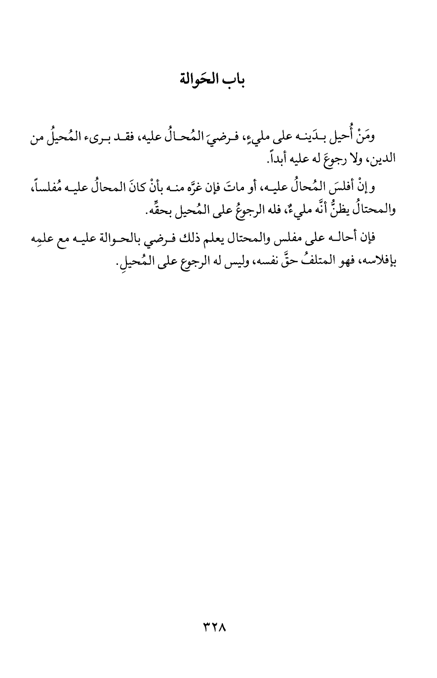 ومن أُحيل بدينه على مليء, فرضي المحال عليه, فقد برئ المحيل من الدين, ولا رجوع له عليه أبدا.