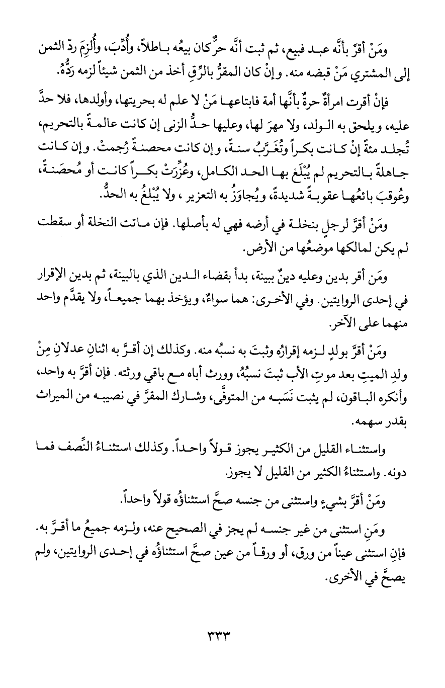 ومن أقر بولد لزمه إقراره وثبت به نسبه منه. وكذلك إن أقر به اثنان عدلان من ولد الميت بعد موت الأب ثبت نسبه, وورث أباه مع باقي ورثته. فإن أقر به واحد, وأنكره الباقون, لم يثبت نسبه من المتوفى, وشارك المقر في نصيبه من الميراث بقدر سهمه.