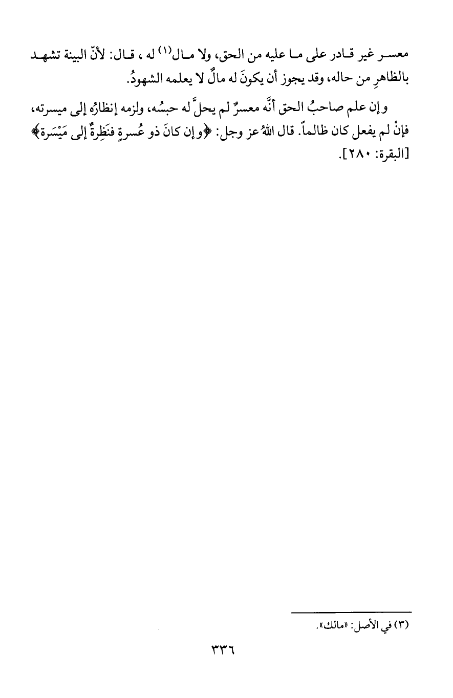 وإن علم صاحب الحق أنه معسر لم يحل له حبسه, ولزمه إنظاره إلى ميسرته, فإن لم يفعل كان ظالما. قال الله عز وجل: {وإن كان ذو عسرة فنظرة إلى ميسرة} [البقرة: 280].