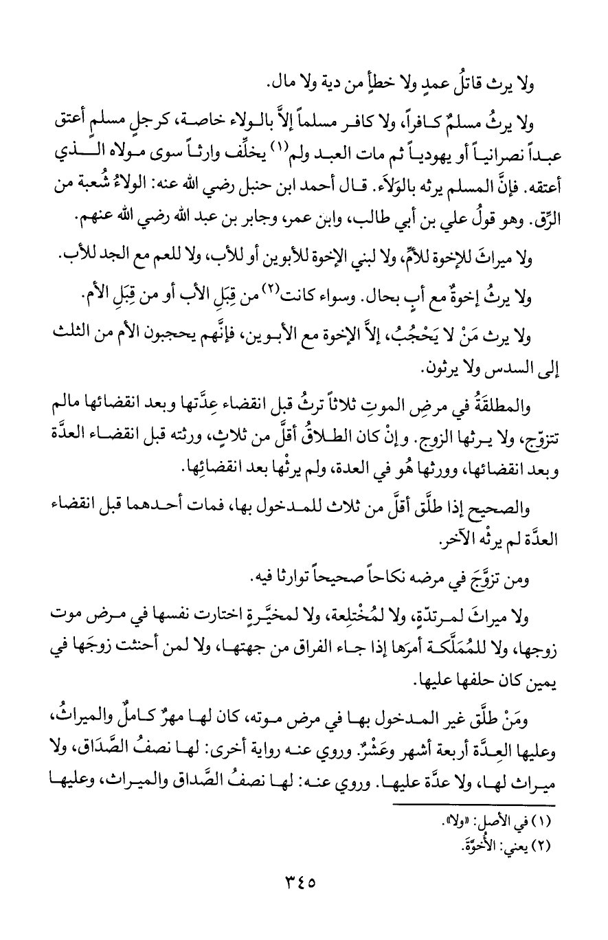ولا ميراث لمرتدة, ولا لمختلعة, ولا لمخيَّرةٍ اختارت نفسها في مرض موت زوجها, ولا للمُمَلَّكة أمرها إذا جاء الفراق من جهتها, ولا لمن أحنثت زوجها في يمين كان حلفها عليها.