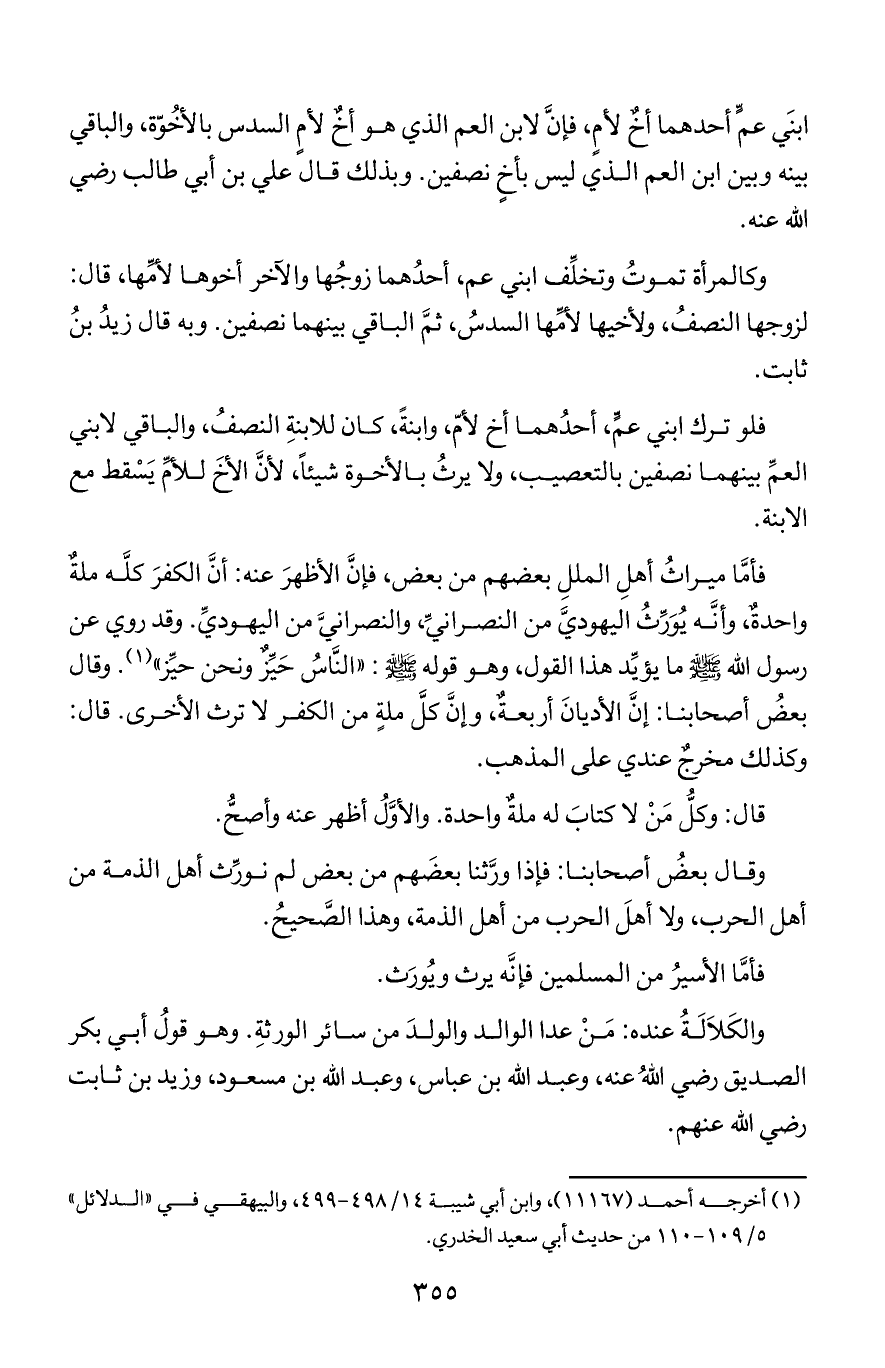 ابني عم أحدهما أخ لأم, فإن لابن العم الذي هو أخ لأم السدس بالأخوة, والباقي بينه وبين ابن العم الذي ليس بأخ نصفين. وبذلك قال علي بن أبي طالب رضي الله عنه.