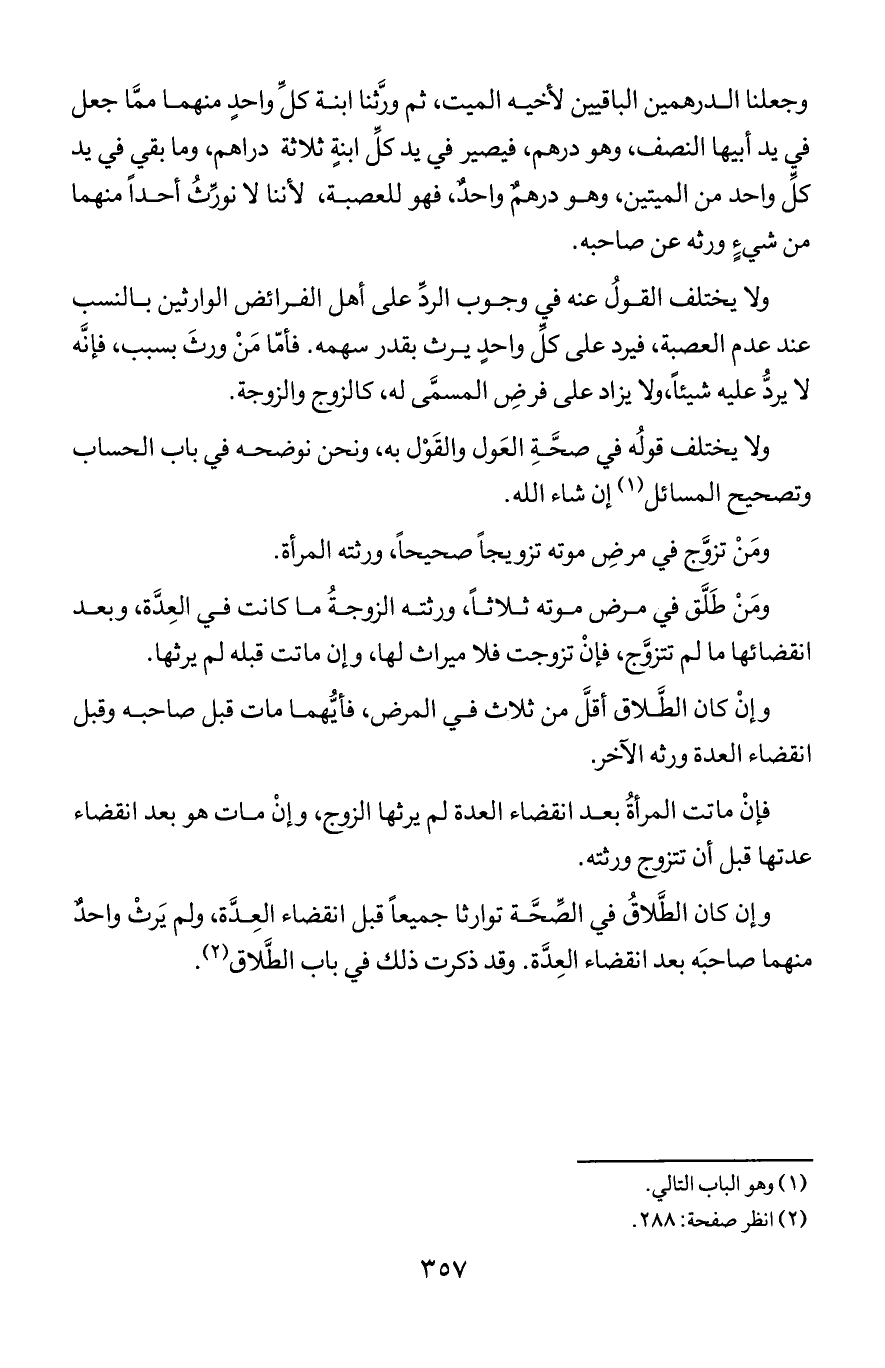 وجعلنا الدرهمين الباقيين لأخيه الميت, ثم ورثنا ابنة كل واحد منهما مما جعل في يد أبيها النصف, وهو درهم, فيصير في يد كل ابنة ثلاثة دراهم, وما بقي في يد كل واحدة من الميتين, وهو درهم واحد, فهو للعصبة, لأننا لا نورث أحدا منهما من شيء ورثه عن صاحبه.