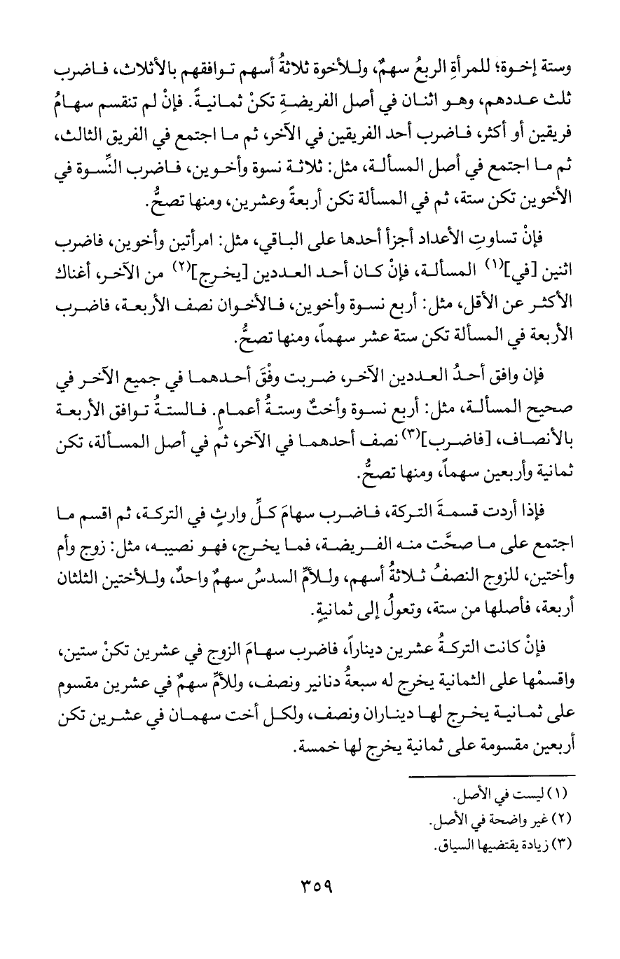 وستة إخوة؛ للمرأة الربع سهم, وللإخوة ثلاثة أسهم توافقهم بالأثلاث, فاضرب ثلث عددهم, وهو اثنان في أصل الفريضة تكن ثمانية. فإن لم تنقسم سهام فريقين أو أكثر, فاضرب أحد الفريقين في الآخر, ثم ما اجتمع في الفريق الثالث, ثم ما اجتمع في أصل المسألة, مثل: ثلاثة نسوة وأخوين, فاضرب النسوة في الأخوين تكن ستة, ثم في المسألة تكن أربعة وعشرين, ومنها تصح.