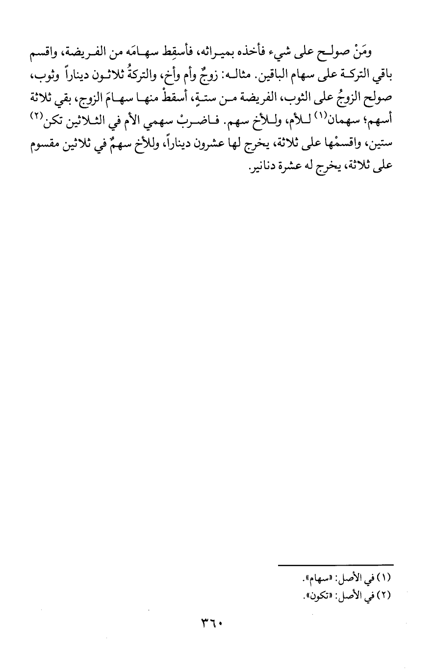 ومن صولح على شيء فأخذه بميراثه, فأسقط سهامه من الفريضة, واقسم باقي التركة على سهام الباقين. مثاله: زوج وأم وأخ, والتركة ثلاثون دينارا وثوب, صولح الزوج على الثوب, الفريضة من ستة, أسقط سهام الزوج, بقي ثلاثة أسهم؛ سهمان للأم, وللأخ سهم. فاضرب سهمي الأم في الثلاثين تكن ستين, واقسمها على ثلاثة, يخرج لها عشرون دينارا, وللأخ سهم في ثلاثين مقسوم على ثلاثة, يخرج له عشرة دنانير.