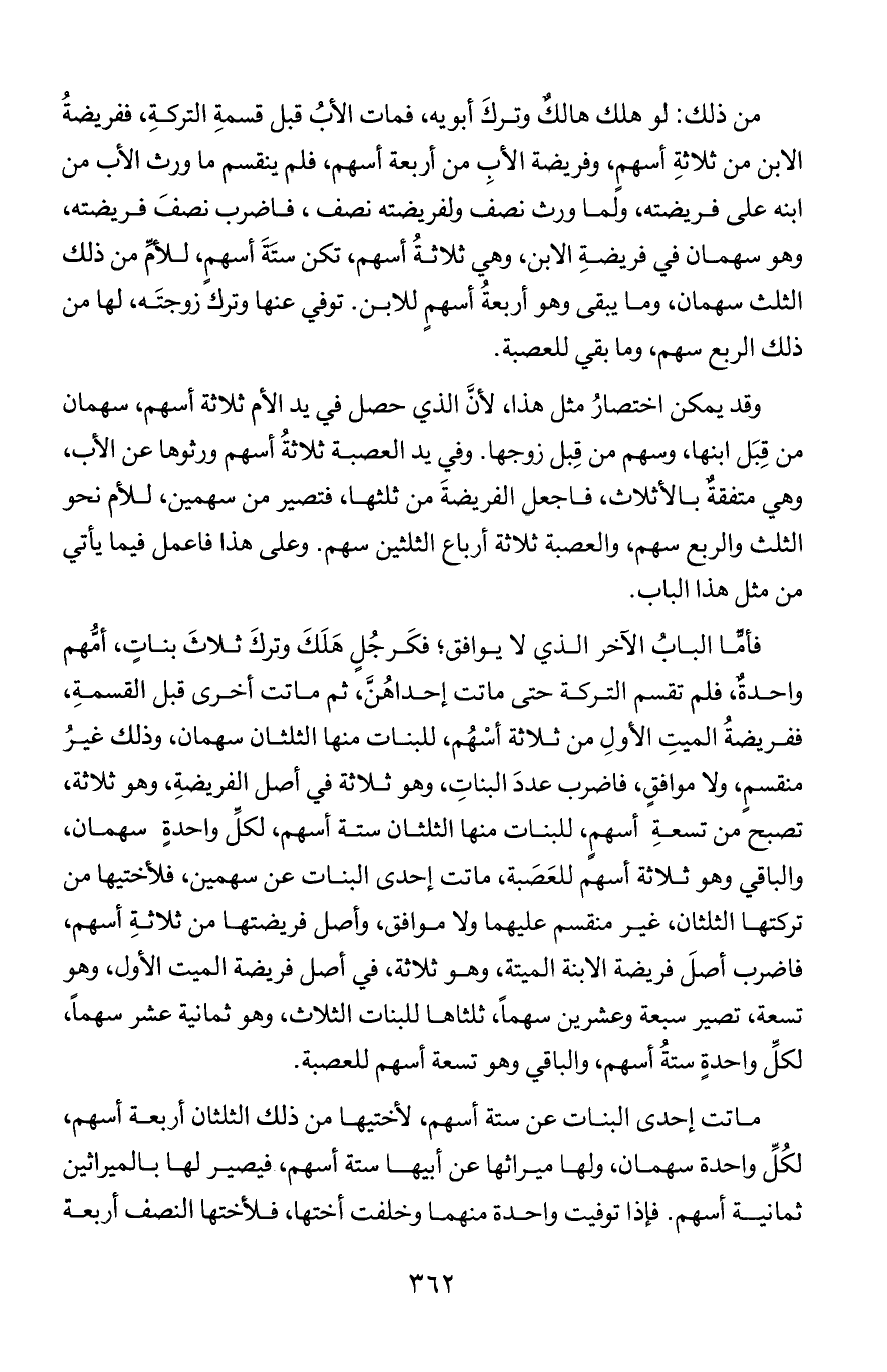 من ذلك: لو هلك هالك وترك أبويه, فمات الأب قبل قسمة التركة, ففريضة الابن من ثلاثة أسهم, وفريضة الأب من أربعة أسهم, فلم ينقسم ما ورث الأب من ابنه على فريضته, ولما ورث نصف ولفريضته نصف, فاضرب نصف فريضته, وهو سهمان في فريضة الابن, وهي ثلاثة أسهم, تكن ستة أسهم, للأم من ذلك الثلث سهمان, وما يبقى وهو أربعة أسهم للابن. توفي عنها وترك زوجته, لها من ذلك الربع سهم, وما بقي للعصبة.