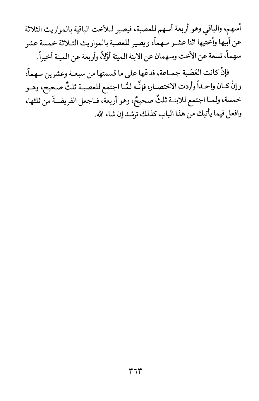 أسهم, والباقي وهو أربعة أسهم للعصبة, فيصير للأخت الباقية بالمواريث الثلاثة عن أبيها وأختيها اثنا عشر سهما, ويصير للعصبة بالمواريث الثلاثة خمسة عشر سهما, تسعة عن الأخت وسهمان عن الابنة الميتة أولا, وأربعة عن الميتة أخيرا.