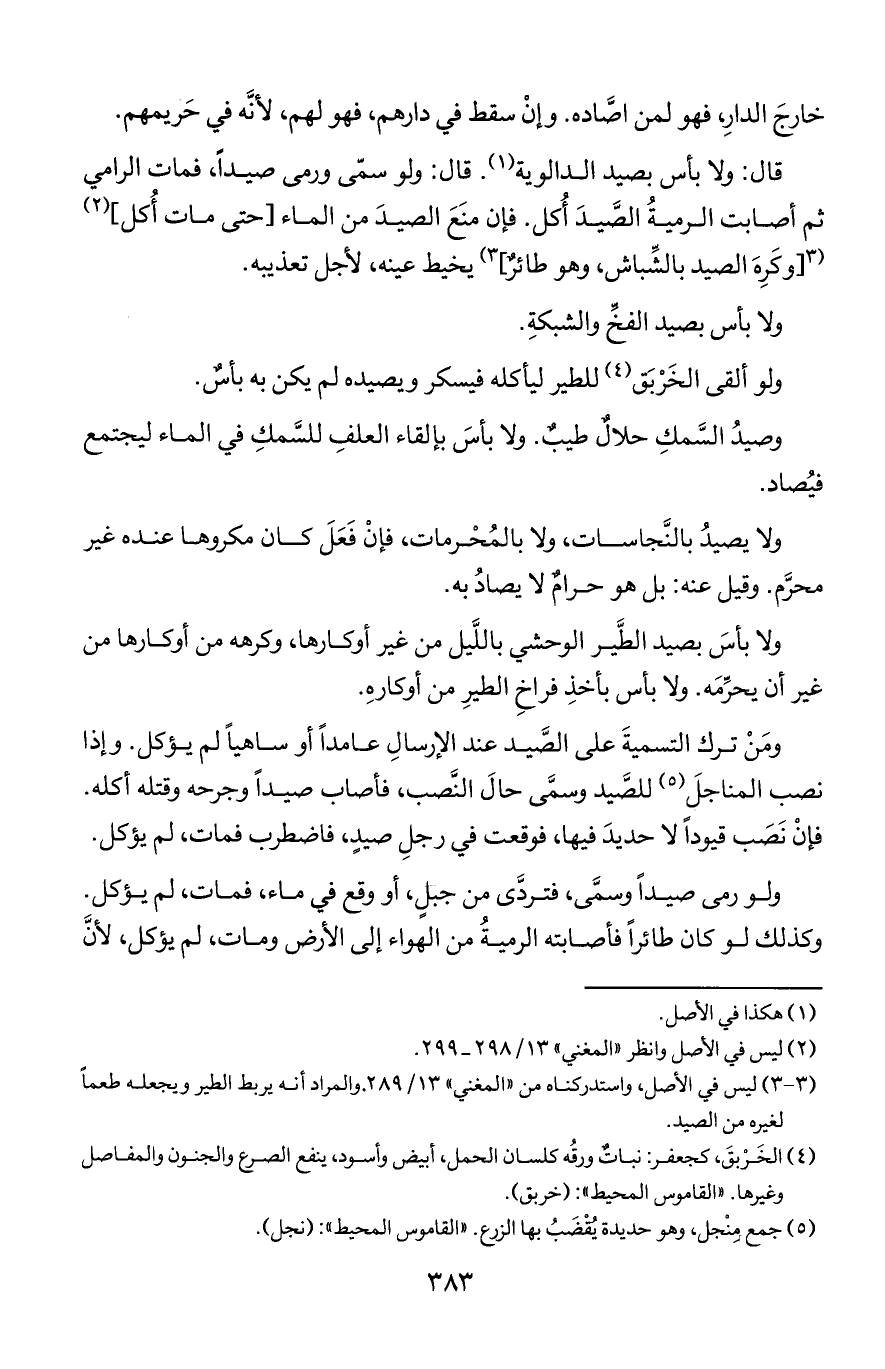 قال: ولا بأس بصيد الدالوية. قال: ولو سمى ورمى صيدا, فمات الرامي ثم أصابت الرمية الصيد أُكل. فإن منع الصيد من الماء حتى مات أكل وكره الصيد بالشِّباش, وهو طائر يخيط عينه, لأجل تعذيبه.