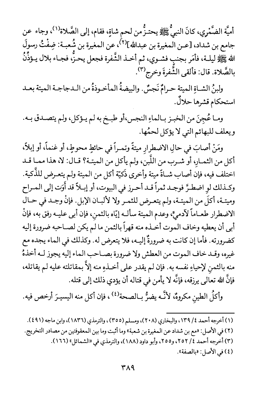 أمية الضَّمري, كان النبي صلى الله عليه وسلم يحتز من لحم الشاة, فقام, إلى الصلاة, وجاء عن جامع بن شداد, عن المغيرة بن عبدالله, عن المغيرة بن شعبة: ضِفتُ رسول الله صلى الله عليه وسلم ليلة, فأمر بجنب فشوي, ثم أخذ الشفرة فجعل يحز, فجاء بلال يؤذن بالصلاة. قال: فألقى الشفرة وخرج.