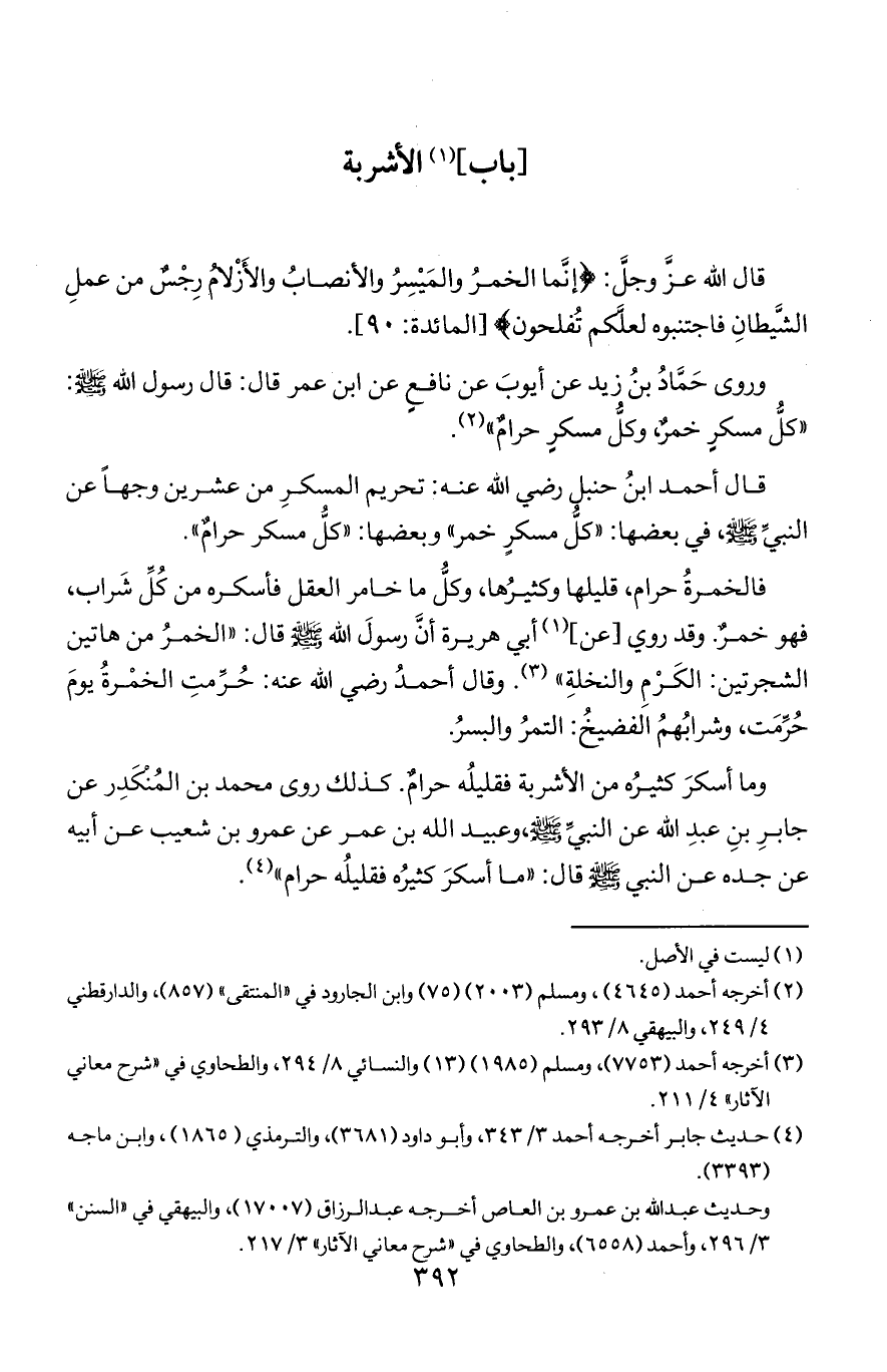 وما أسكر كثيره من الأشربة فقليله حرام. كذلك روى محمد بن المنكدر عن جابر بن عبدالله عن النبي صلى الله عليه وسلم, وعبيد الله بن عمر عن عمرو بن شعيب عن أبيه عن جده عن النبي صلى الله عليه وسلم قال: "ما أسكر كثيره فقليله حرام".
