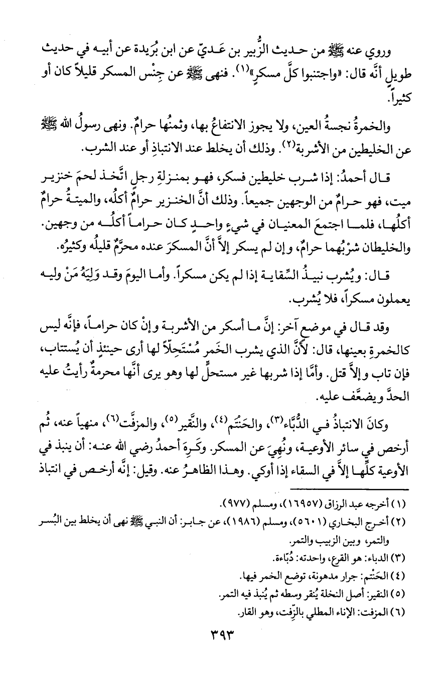 وكان الانتباذ في الدباء, والحَنتَم, والنقير, والمزفت, منهيا عنه, ثم أرخص في سائر الأوعية, ونهي عن المسكر. وكره أحمد رضي الله عنه: أن ينبذ في الأوعية كلها إلا في السقاء إذا أوكي. وهذا الظاهر عنه. وقيل: إنه أرخص في انتباذ