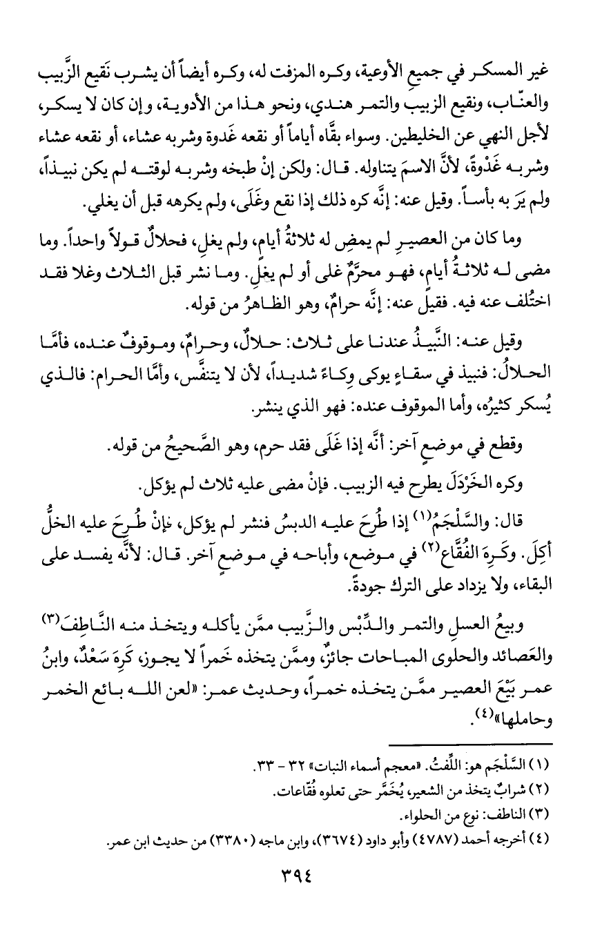 غير المسكر في جميع الأوعية, وكره المزفت له, وكره أيضا أن يشرب نقيع الزبيب والعناب, ونقيع الزبيب والتمر هندي, ونحو هذا من الأدوية, وإن كان لا يسكر, لأجل النهي عن الخليطين. وسواء بقَّاه أياما أو نقعه غدوة وشربه عشاء, أو نقعه عشاء وشربه غدوة, لأن الاسم يتناوله. قال: ولكن إن طبخه وشربه لوقته لم يكن نبيذا, ولم ير به بأسا. وقيل عنه: إنه كره ذلك إذا نقع وغلى, ولم يكرهه قبل أن يغلي.