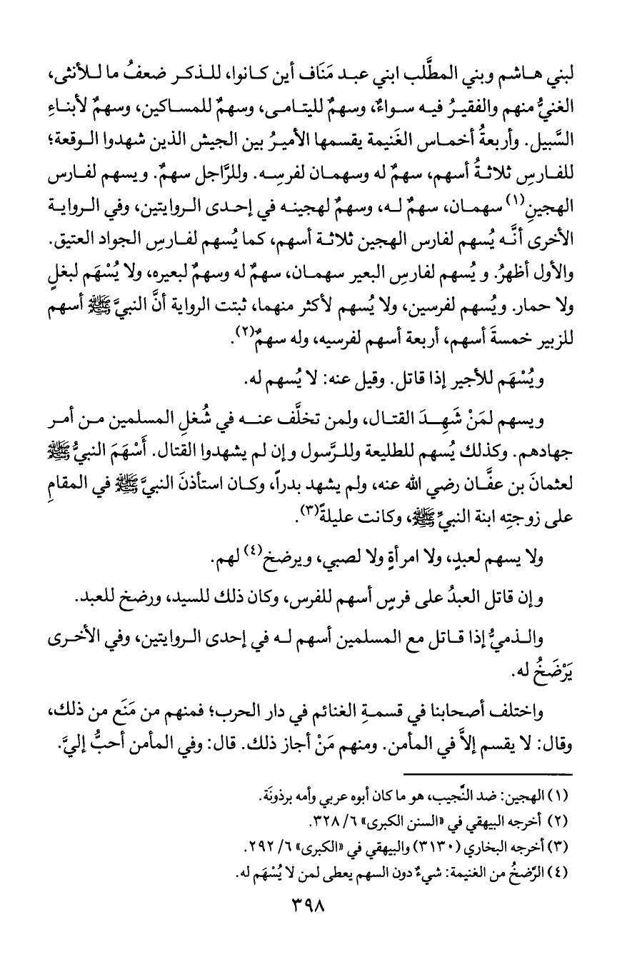 ويسهم لمن شهد القتال, ولمن تخلف عنه في شغل المسلمين من أمر جهادهم. وكذلك يسهم للطليعة وللرسول وإن لم يشهدوا القتال. أسهم النبي صلى الله عليه وسلم لعثمان بن عفان رضي الله عنه, ولم يشهد بدرا, وكان استأذن النبي صلى الله عليه وسلم في المقام على زوجته ابنة النبي صلى الله عليه وسلم, وكانت عليلة.