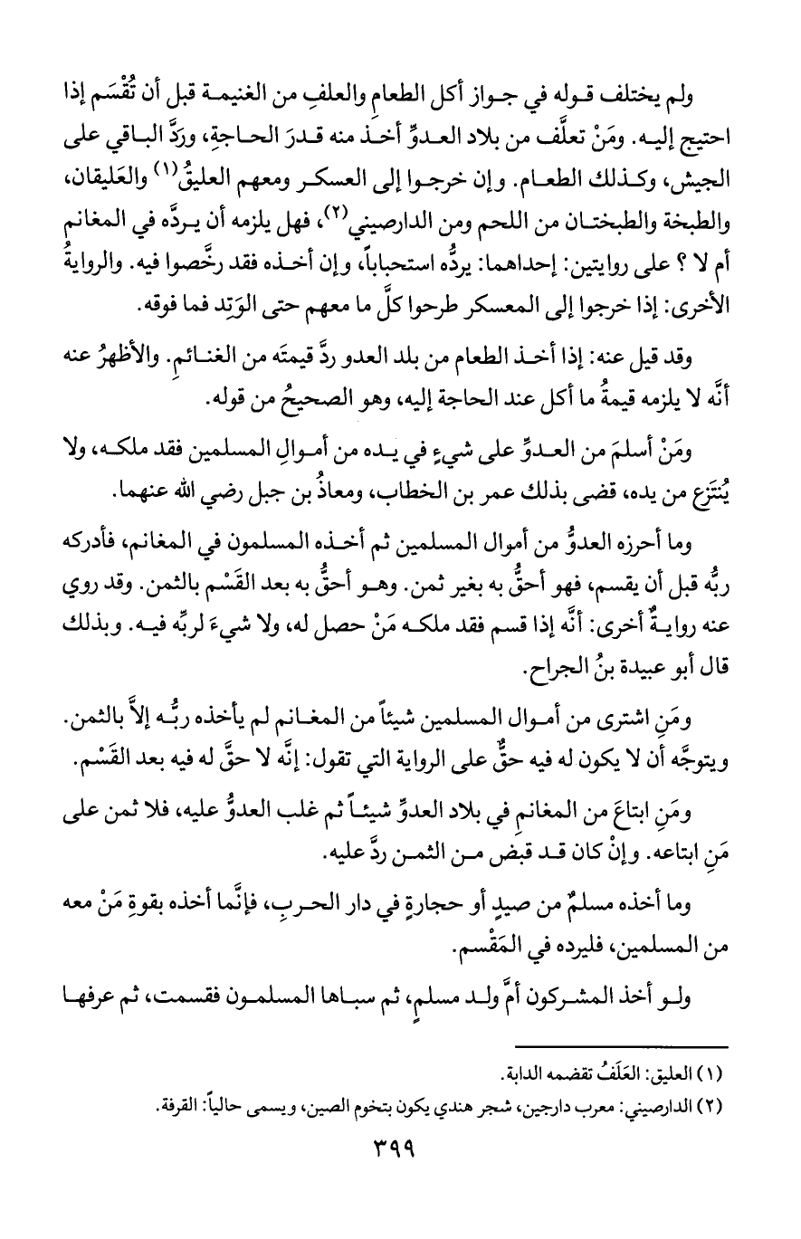 ولم يختلف قوله في جواز أكل الطعام والعلف من الغنيمة قبل أن تُقسم إذا احتيج إليه. ومن تعلف من بلاد العدو أخذ منه قدر الحاجة, ورد الباقي على الجيش, وكذلك الطعام. وإن خرجوا إلى العسكر ومعهم العليق والعليقان, والطبخة والطبختان من اللحم ومن الدارصيني, فهل يلزمه أن يرده في المغانم أم لا؟ على روايتين: إحداهما: يرده استحبابا. وإن أخذه فقد رخصوا فيه. والرواية الأخرى: إذا خرجوا إلى المعسكر طرحوا كل ما معهم حتى الوتد فما فوقه.