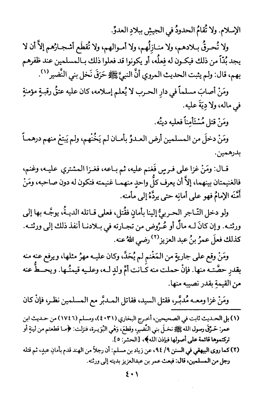 ولا تحرق بلادهم, ولا منازلهم, ولا أموالهم, ولا تقطع أشجارهم إلا أن لا يجد بدا من ذلك فيكون له فعله, أو يكونوا قد فعلوا ذلك بالمسلمين عند ظفرهم بهم, قال: ولم يثبت الحديث المروي أن النبي صلى الله عليه وسلم حرق نخل بني النضير.