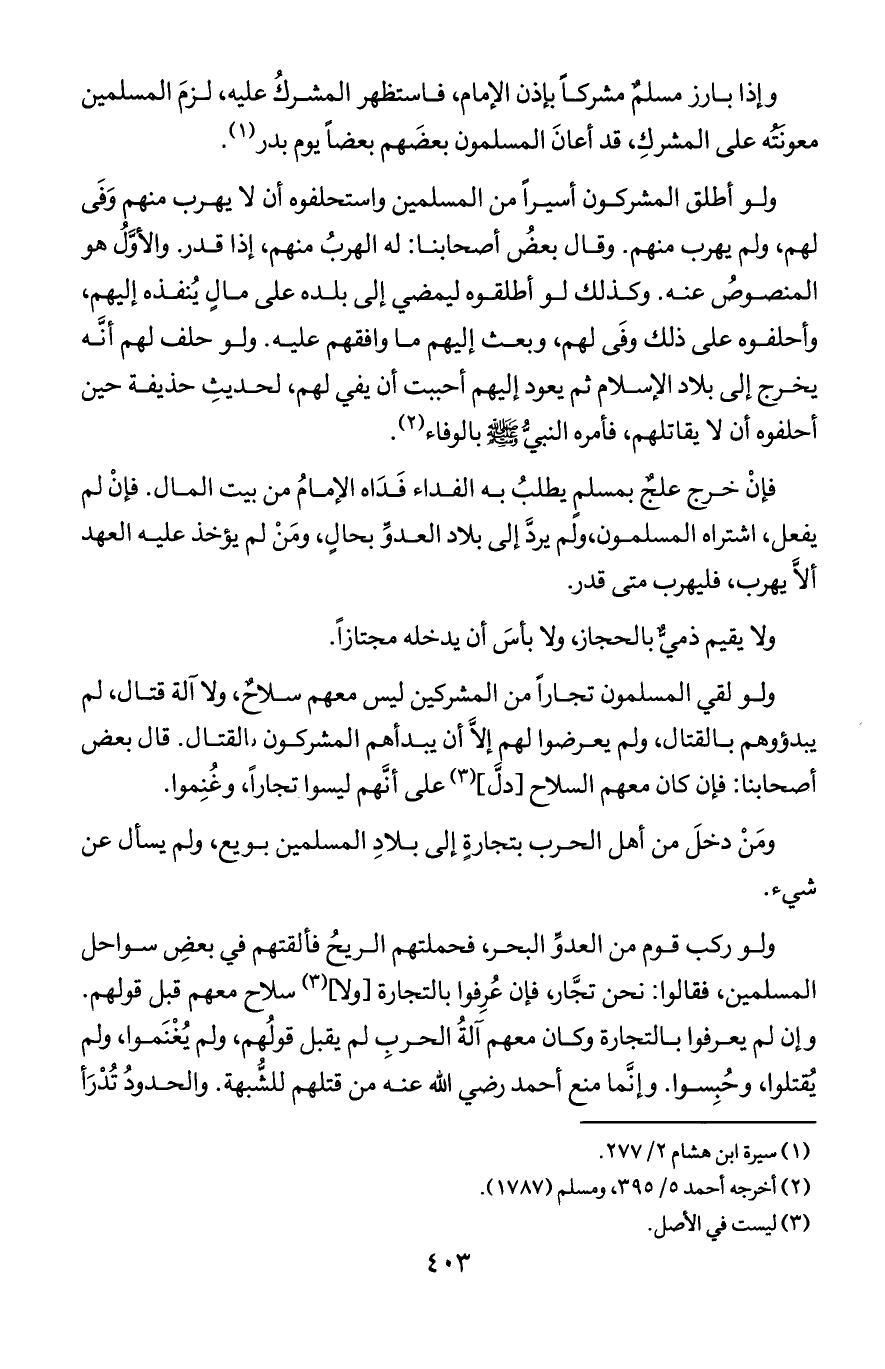 ولو أطلق المشركون أسيرا من المسلمين واستحلفوه أن لا يهرب منهم وفى لهم, ولم يهرب منهم. وقال بعض أصحابنا: له الهرب منهم, إذا قدر. والأول هو المنصوص عنه. وكذلك لو أطلقوه ليمضي إلى بلده على مال ينفذه إليهم, وأحلفوه على ذلك وفى لهم, وبعث إليهم ما وافقهم عليه. ولو حلف لهم أنه يخرج إلى بلاد الإسلام ثم يعود إليهم أحببت أن يفي لهم, لحديث حذيفة حين أحلفوه أن لا يقاتلهم, فأمره النبي صلى الله عليه وسلم بالوفاء.