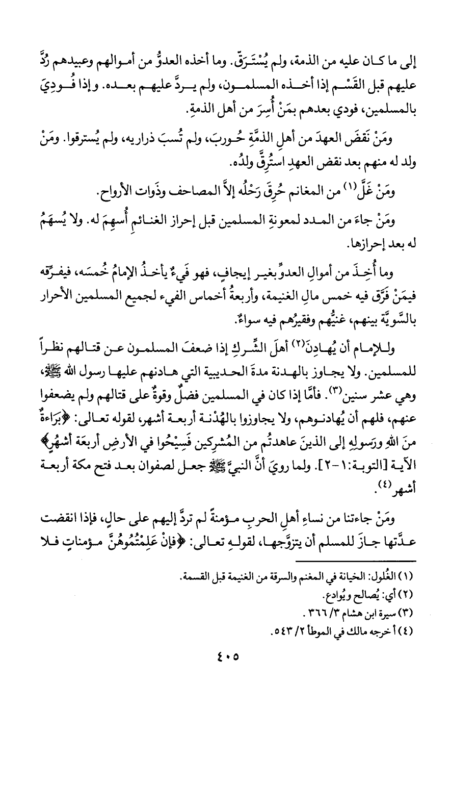 وللإمام أن يهادن أهل الشرك إذا ضعف المسلمون عن قتالهم نظرا للمسلمين. ولا يجاوز بالهدنة مدة الحديبية التي هادنهم عليها رسول الله صلى الله عليه وسلم, وهي عشر سنين. فأما إذا كان في المسلمين فضل وقوة على قتالهم ولم يضعفوا عنهم, فلهم أن يهادنوهم, ولا يجاوزوا بالهدنة أربعة أشهر, لقوله تعالى: {براءة من الله ورسوله إلى الذين عاهدتم من المشركين فسيحوا في الأرض أربعة أشهر} الآية [التوبة: 1 - 2]. ولما روي أن النبي صلى الله عليه وسلم جعل لصفوان بعد فتح مكة أربعة أشهر.