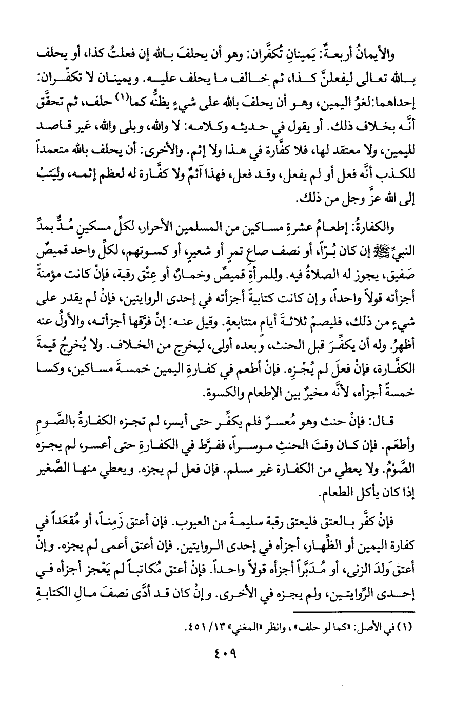 والكفارة: إطعام عشرة مساكين من المسلمين الأحرار, لكل مسكين مد بمد النبي صلى الله عليه وسلم إن كان برا, أو نصف صاع تمر أو شعير, أو كسوتهم, لكل واحد قميص صفيق, يجوز له الصلاة فيه. وللمرأة قميص وخمار, أو عتق رقبة, فإن كانت مؤمنة أجزأته قولا واحدا, وإن كانت كتابية أجزأته في إحدى الروايتين, فإن لم يقدر على شيء من ذلك, فليصم ثلاثة أيام متتابعة. وقيل عنه: إن فرقها أجزأته, والأول عنه أظهر. وله أن يكفر قبل الحنث, وبعده أولى, ليخرج من الخلاف. ولا يخرج قيمة الكفارة, فإن فعل لم يجزه. فإن أطعم في كفارة اليمين خمسة مساكين, وكسا خمسة أجزأه, لأنه مخير بين الإطعام والكسوة.
